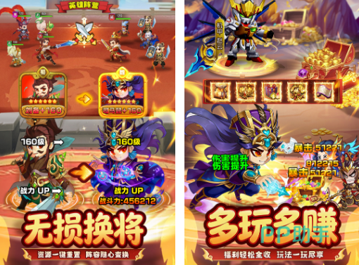 开局就能获得超多的福利,让每一个玩家进入q版的游戏世界中,享受无损换将,资源一键重置等游戏玩法,所具备的特色。也是能进入三国乱世背景的,需要在展开策略卡牌的过程中展现出自己的实力。其中的转盘成长玩法,就是这一款游戏非常有创意的地方。每次通过转动转盘以后,就可以触发很多的随机事件,阵营也能自由搭配。