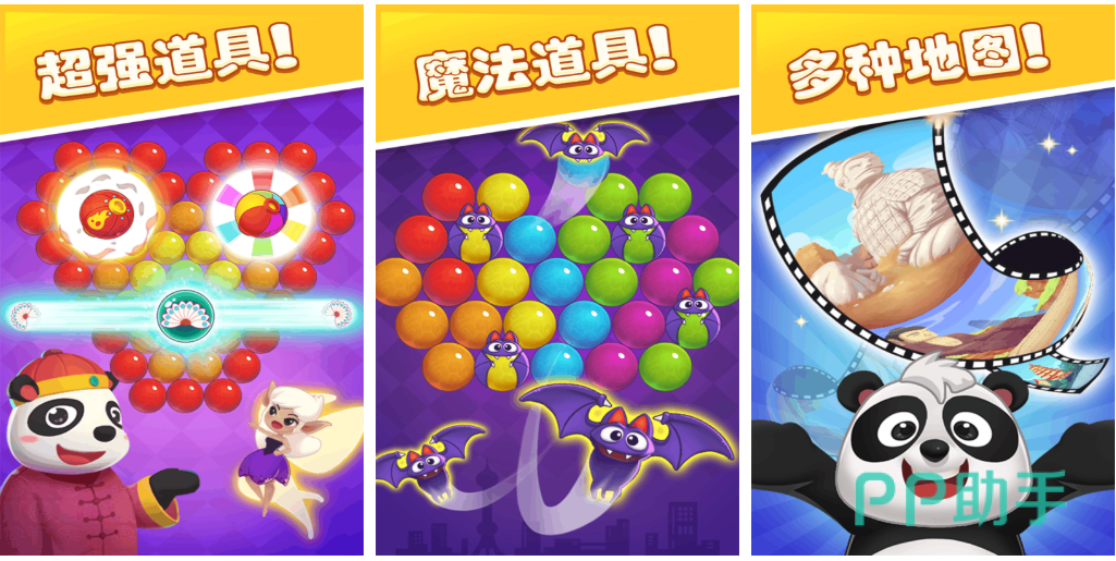 这是款跟熊猫动物元素相关的泡泡龙消除游戏,许多的魔法道具帮助玩家快速消除各种小泡泡,形形色色的地图也可以自由解锁带来新鲜的消除泡泡体验,精彩的剧情和优秀消除特效都是本作的亮点,耐玩性不错的泡泡龙闯关流程让玩家越玩越上瘾,泡泡龙熊猫传奇这款独立版的消除神作带来的后续关卡耐玩性更强。