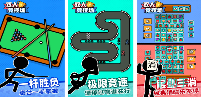 双人竞技场这款公平竞技的同屏手游互动性还是不错的,打台球和赛车竞速这些有趣玩法都极具带入感,三消模式的加持也可以双人挑战带来极高的休闲感,游戏进度超快而且模式众多更让玩家着迷,萌系卡通的背景和视觉效果吸引到的玩家更多,大量有趣新颖的互动模式也让玩家越玩越上头,各位双人同屏游戏爱好者试试这款极为经典的神作吧。