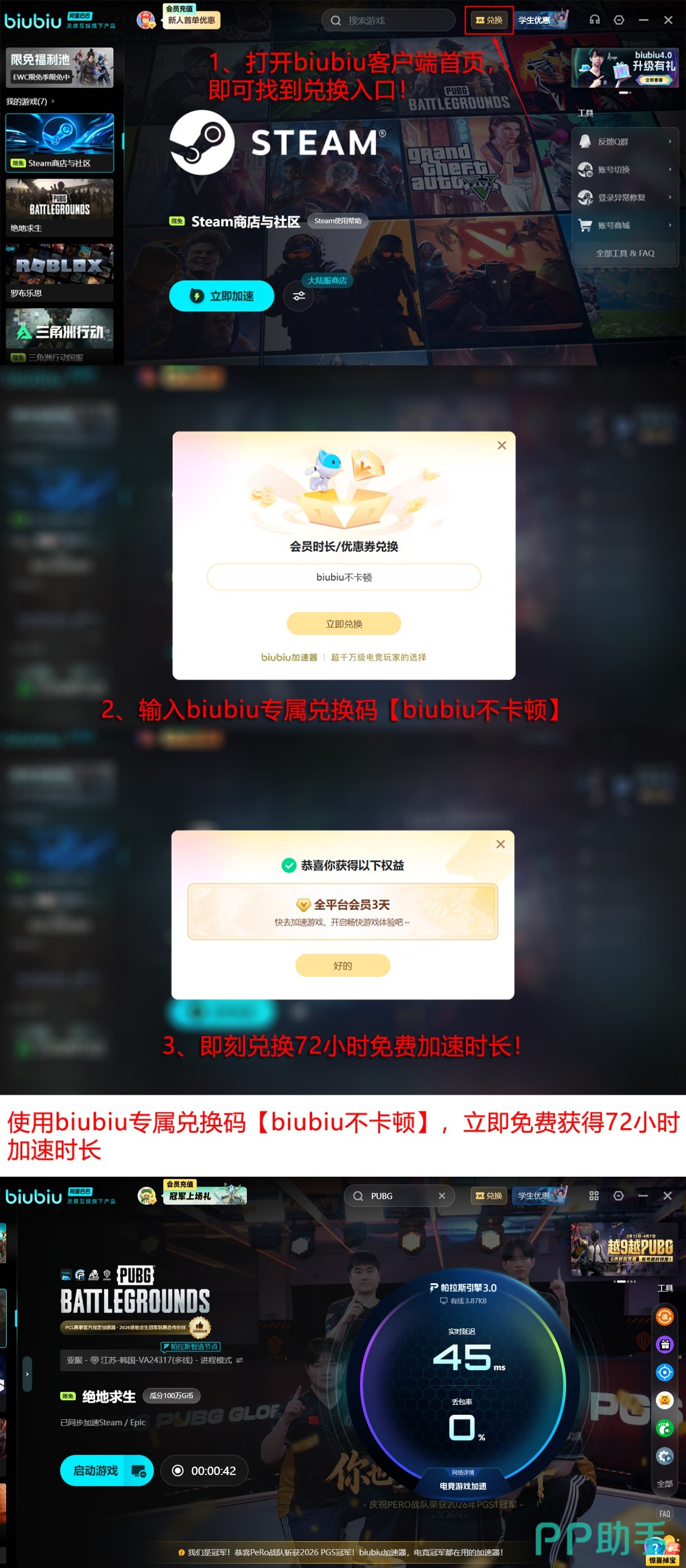 经职业级验证的稳定性表现,印证了biubiu在高并发、低容错类游戏场景下的可靠性。目前官方正开放多项限时权益:新用户注册即赠24小时VIP权限,可无限制使用全部高速节点;所有用户(含存量账号)输入口令【biubiu不卡顿】即可兑换72小时VIP服务,实现无缝续期。综合计算,新注册用户可连续享受总计96小时全功能免费体验,覆盖完整新手成长周期。
