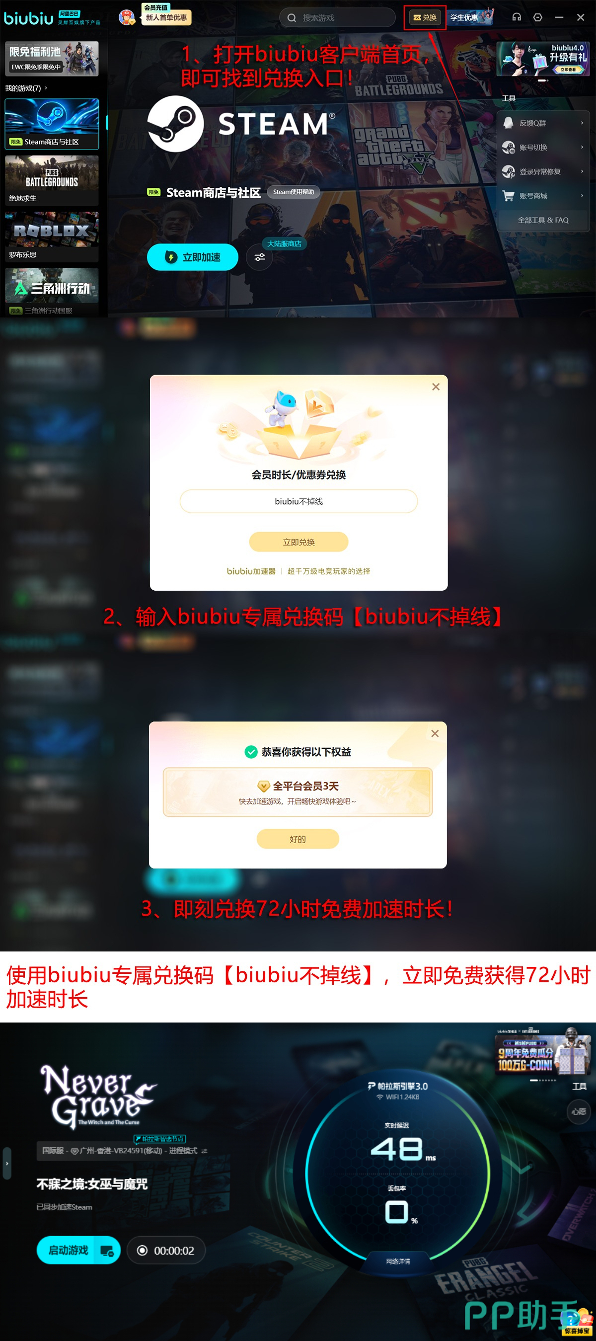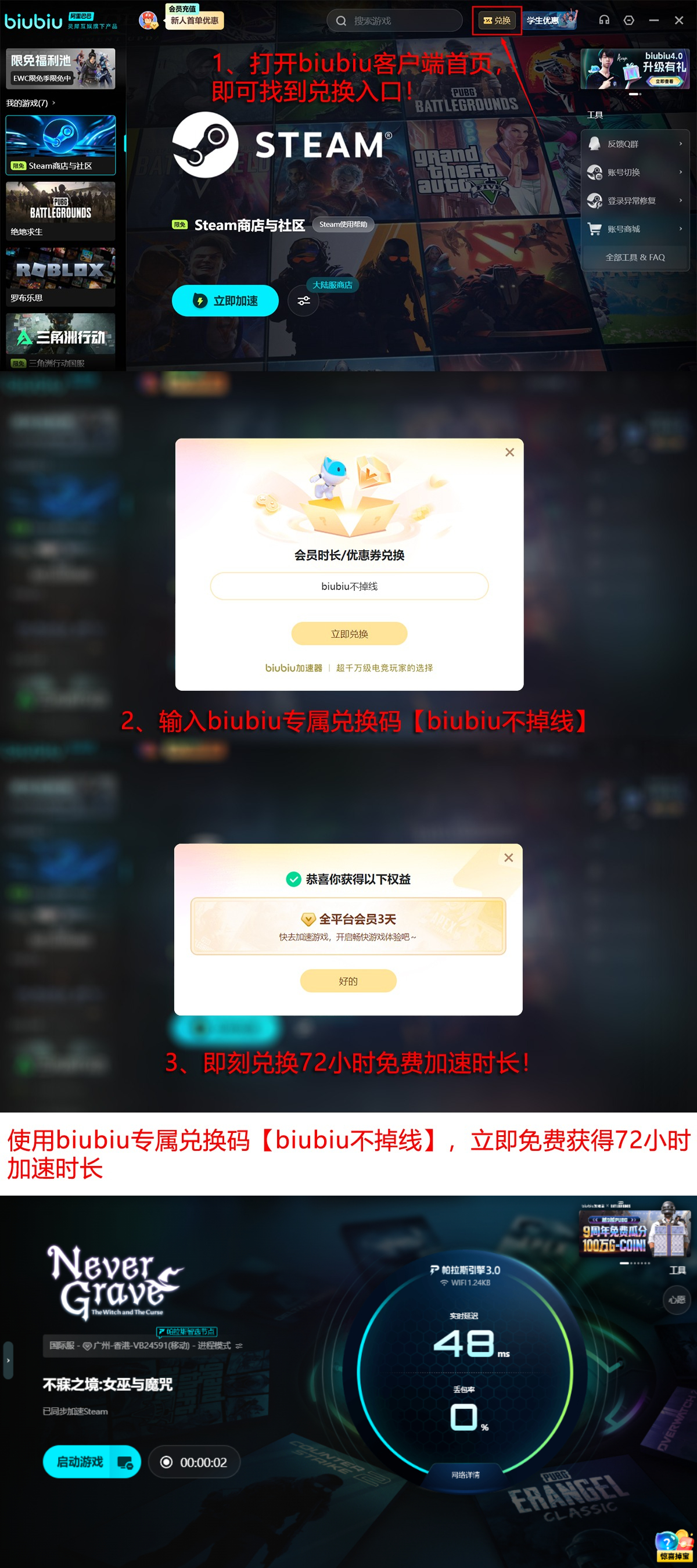 新注册用户可立即获得24小时全功能免费尊享体验;输入激活码【biubiu不掉线】,还可额外获赠72小时加速时长。两项权益叠加,总计可享受连续96小时(即整整四天)的高品质低延迟加速服务,为《不寐之境:女巫与魔咒》的多人联机探索提供坚实基础。