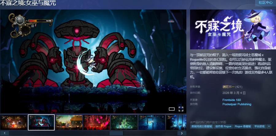 该游戏在Steam商店中采用中英文双标题同步上架——中文名称为“不寐之境:女巫与魔咒”,英文名称为“Never Grave: The Witch and The Curse”。两者均可直接检索并进入商品页。游戏全面支持简体中文界面与字幕,本地化完整;同时原生适配最多4人在线合作模式,支持跨房间组队探索,无需额外插件或第三方工具即可开启联机旅程。