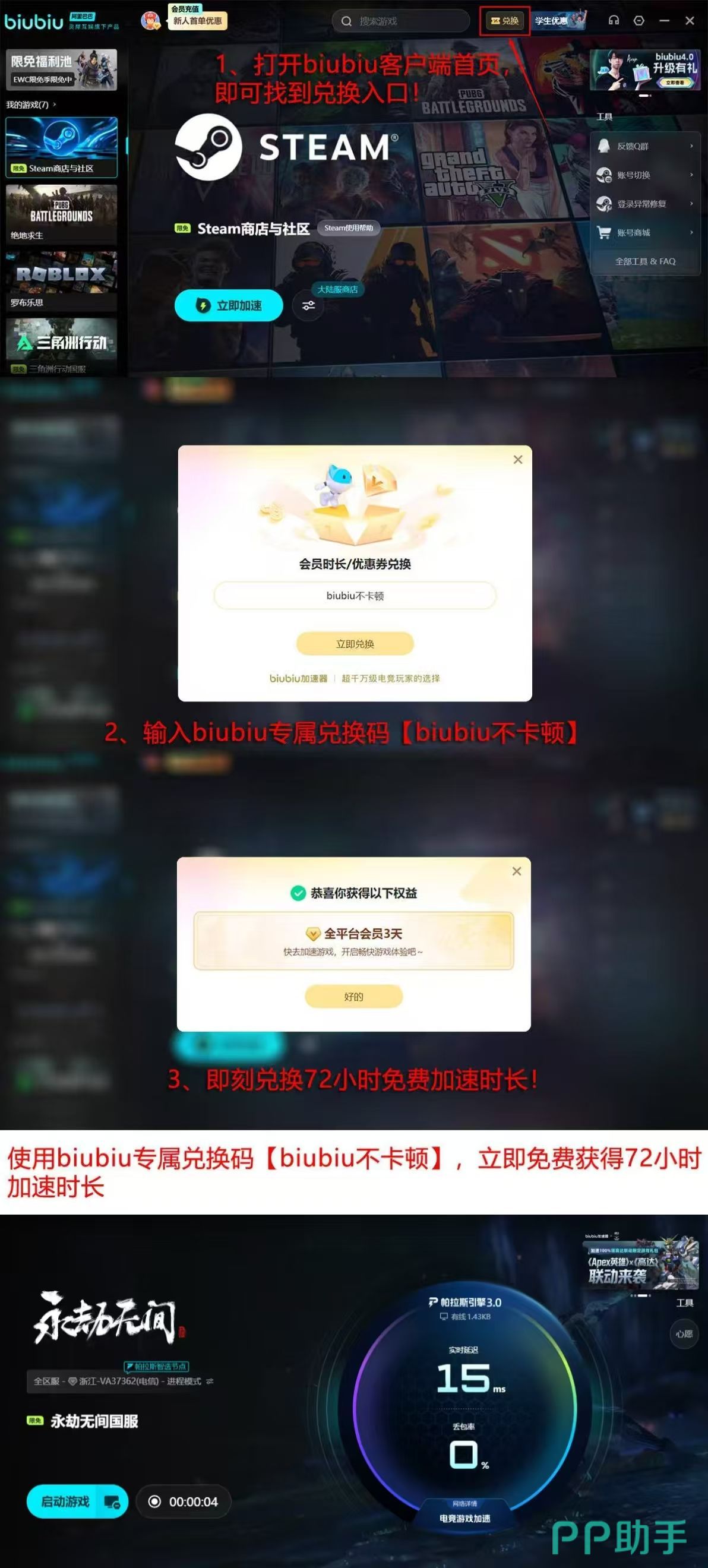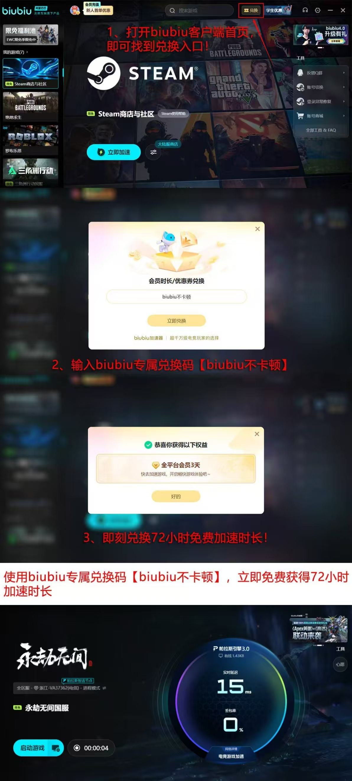 新用户注册后自动获得首日24小时全功能试用权限;输入激活码【biubiu不卡顿】,即可额外领取72小时加速时长,总计享96小时免费体验。