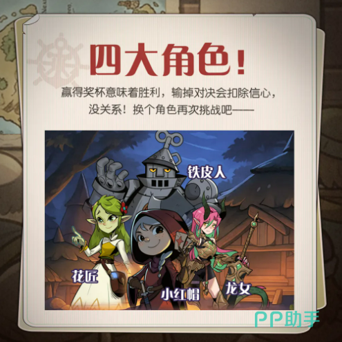 奖杯争夺需主动定位持有者并发起挑战。胜利可夺取对方一枚奖杯,失败则扣除信心值。当信心值归零,当前角色本轮挑战终止。游戏提供四位可选主角:小红帽、花匠、铁皮人、龙女,彼此拥有独立进度与专属成长线。单角色受挫后可无缝切换其他角色继续推进,降低挫败感,提升策略试错空间。