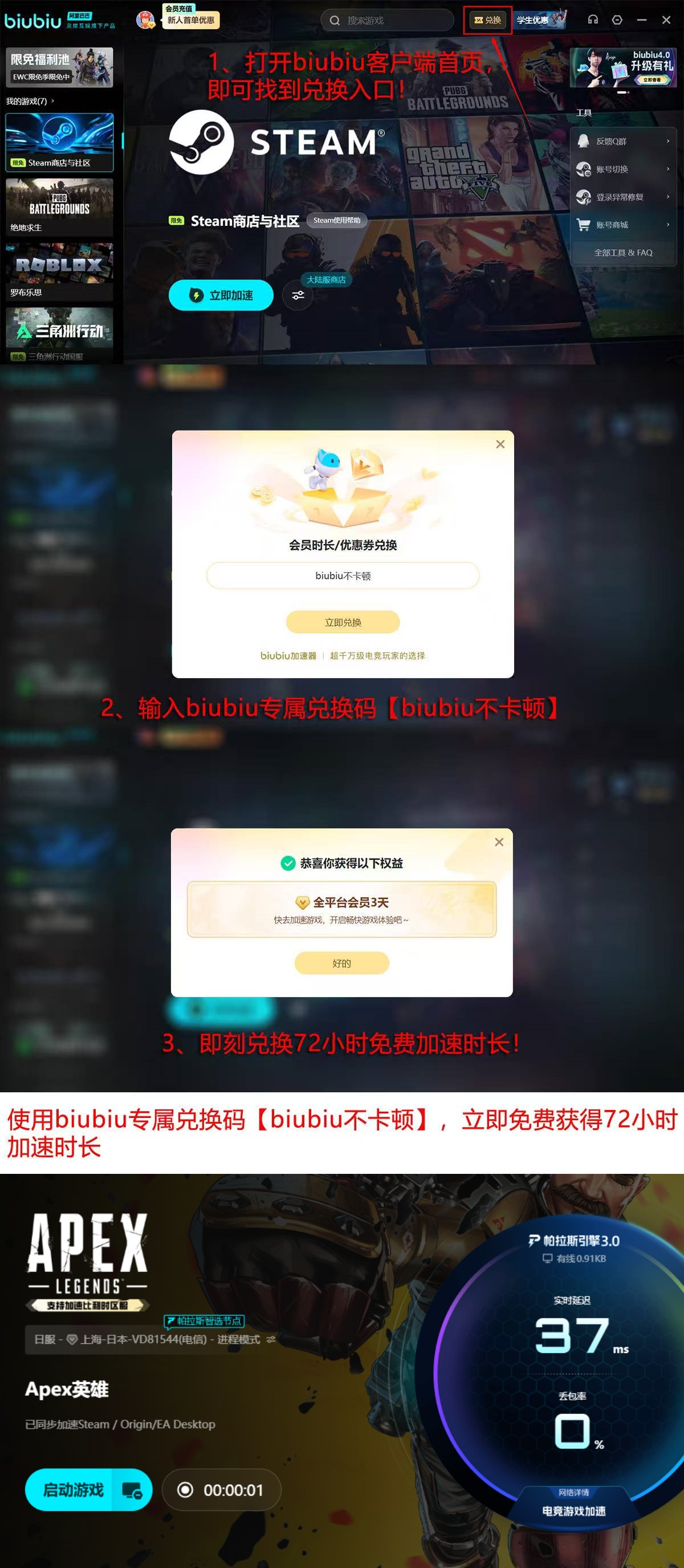 新用户首次启动biubiu,即可获得24小时加速机会,“biubiu不卡顿”在对应界面输入这个口令,额外的3天会员权益直接到账,叠加可获取4天免费时间。