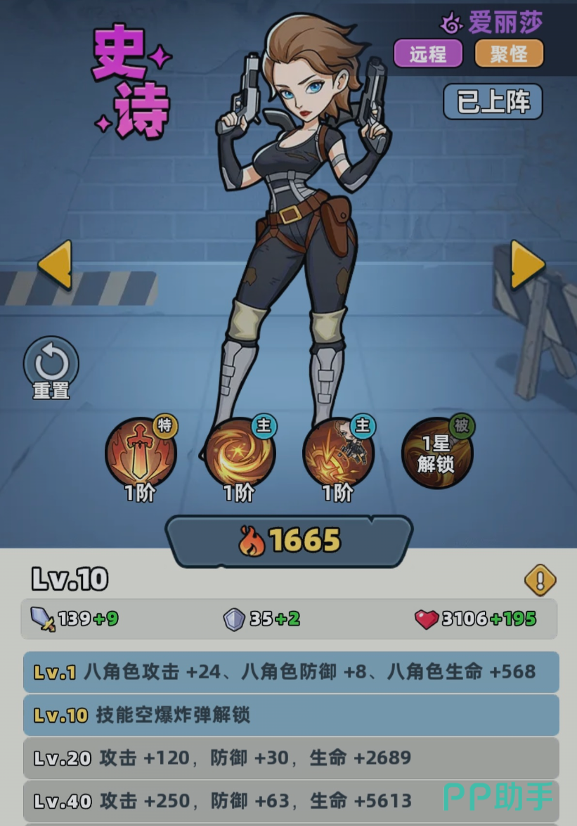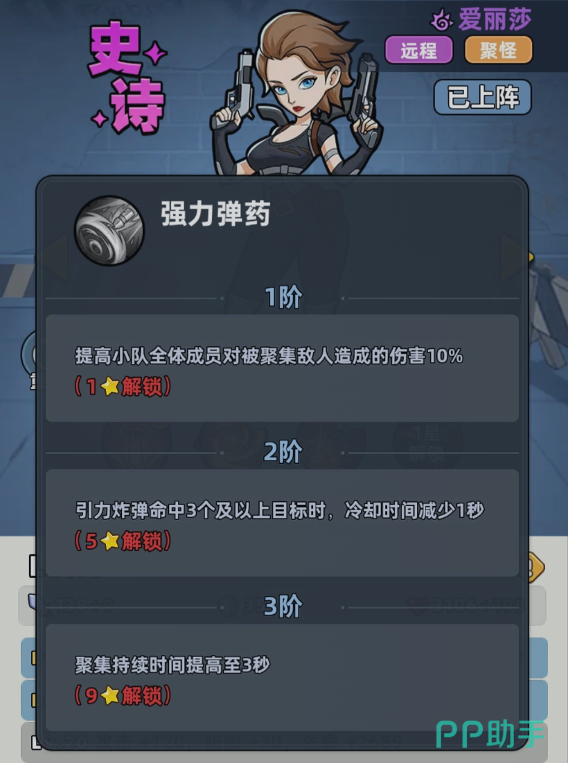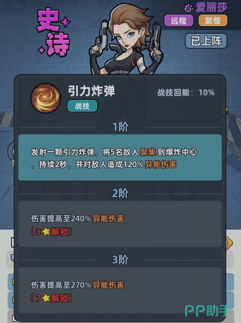 在《生存33天》中,爱丽莎是游戏初期即可通过常规途径获取的稀有辅助角色。她不依赖抽卡概率,上线即用,是新手玩家快速组建成型队伍的关键拼图。其核心机制围绕“远程聚怪+范围控制+团队增益”展开,具备扎实的基础属性成长曲线——每提升一级,攻击、防御、生命三项基础数值同步增长。等级1时已可为全队提供稳定的三围基础加成;升至10级后解锁核心技能“空爆炸弹”,正式激活完整控制链:先以引力炸弹完成多目标吸附与位置压缩,再借空爆炸弹对已聚集单位触发额外伤害判定,形成“控—压—爆”三位一体的战术闭环,显著提升主C群攻技能的命中率与伤害转化效率。
