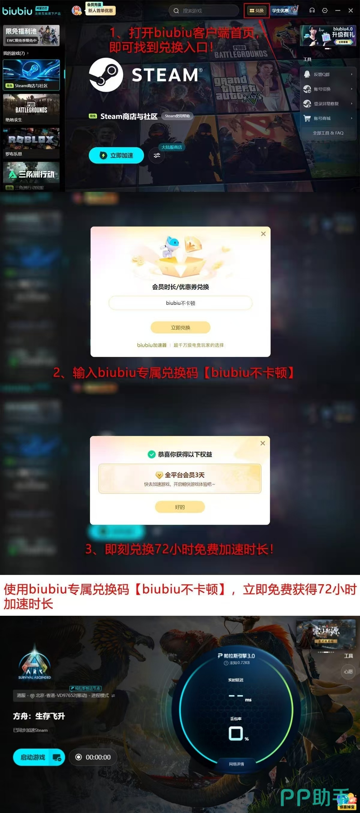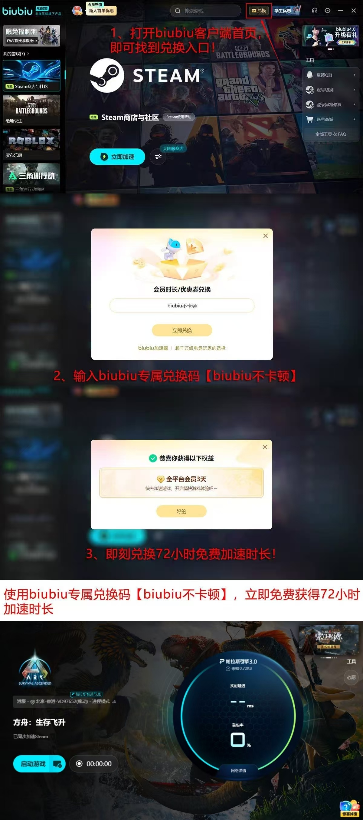新用户完成注册后即可解锁首日24小时全功能试用权限;输入激活码【biubiu不卡顿】,还可额外获赠72小时加速时长,累计享有96小时免费服务体验。