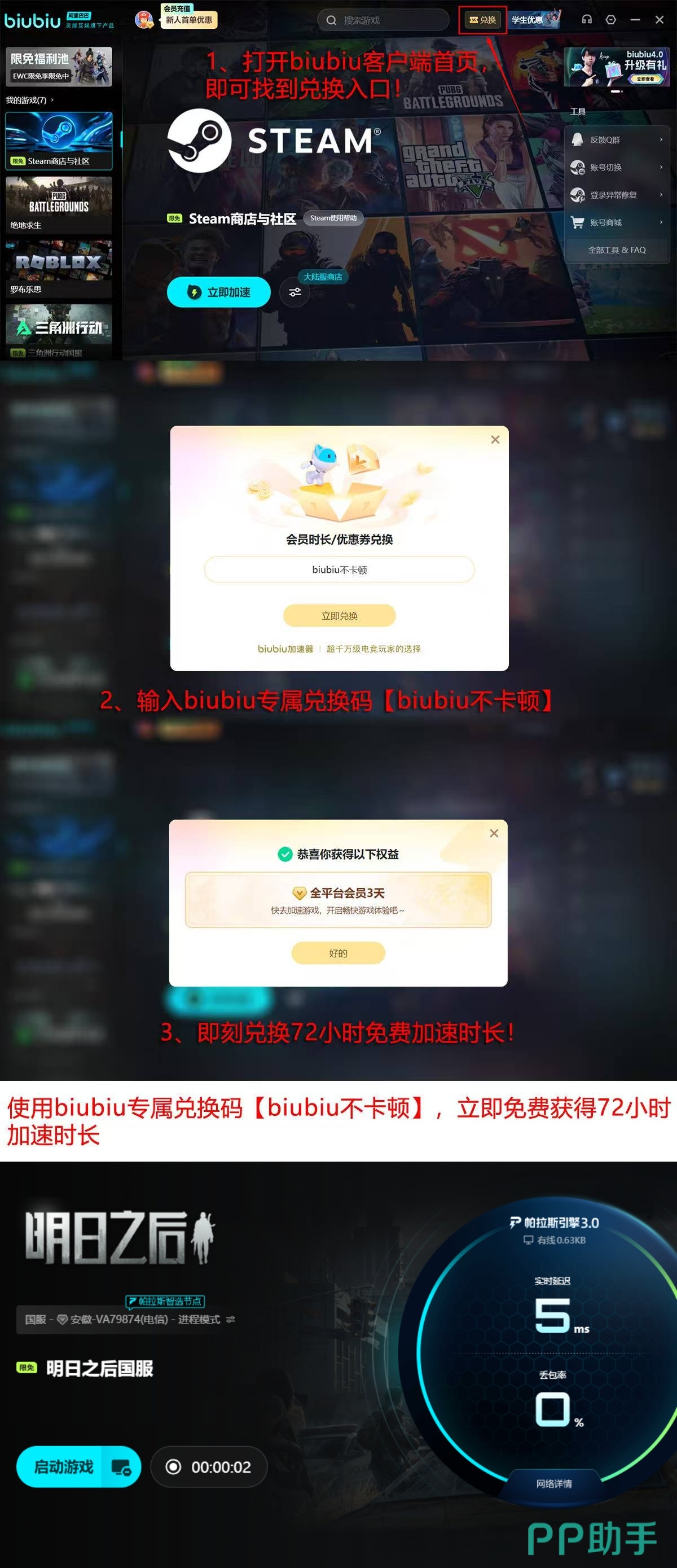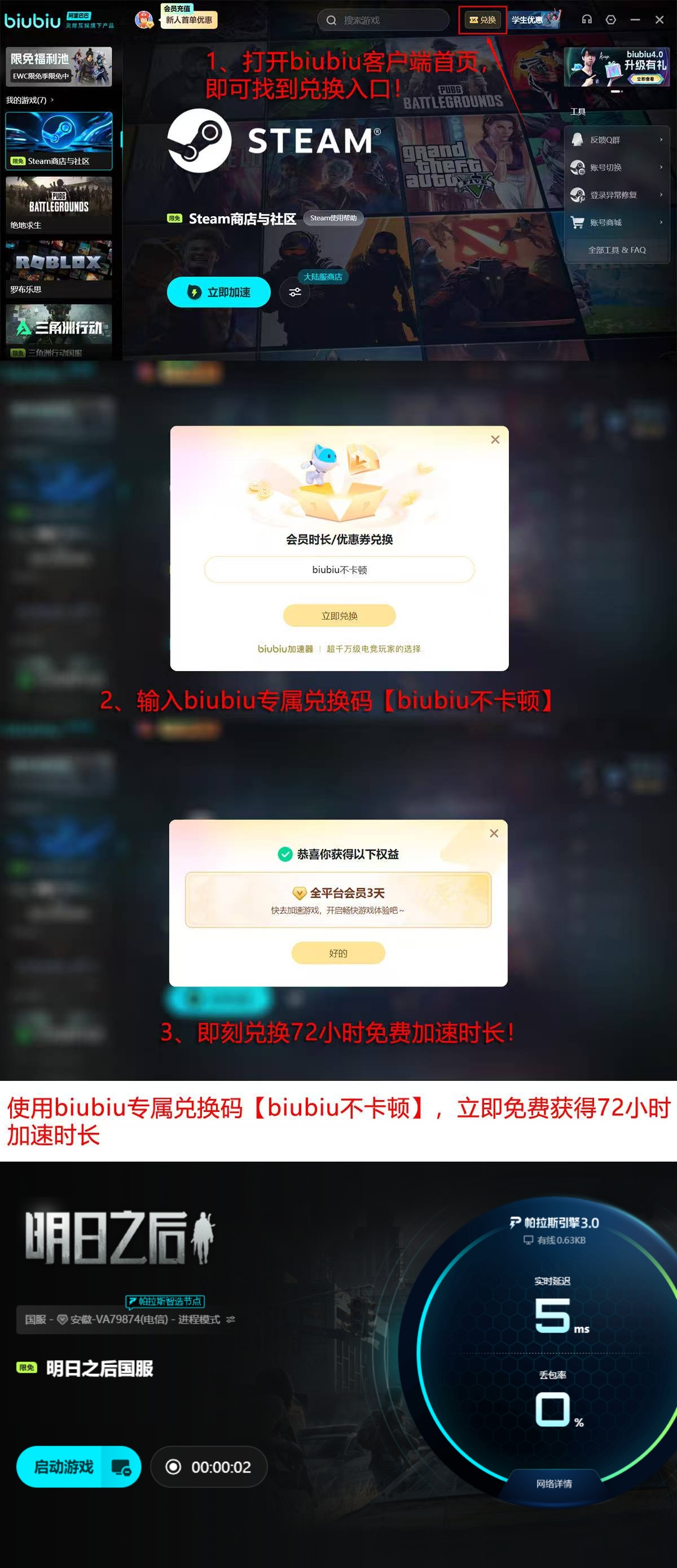 目前该加速平台面向新用户提供多重体验权益:完成账号注册即可获赠24小时全功能免费试用;所有用户(含老用户)在激活界面输入口令【biubiu不卡顿】,额外领取72小时加速时长。综合计算,新用户最高可累计获得96小时无限制使用权限,充分验证其在不同网络环境下的适配表现与稳定性保障能力。