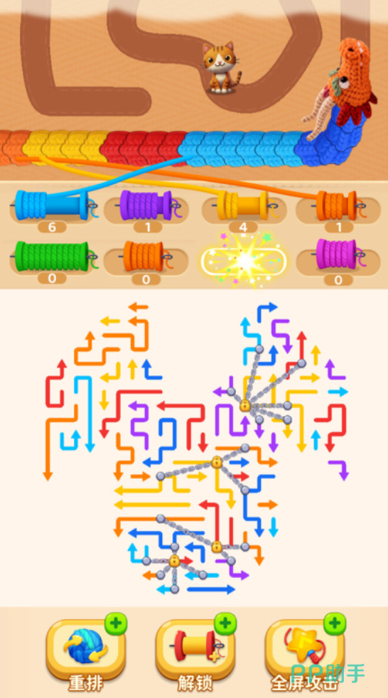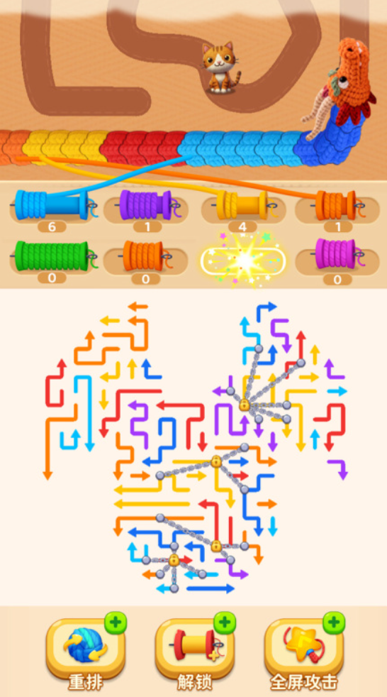 核心玩法围绕“颜色弹药系统”展开:红、蓝、黄等不同色系箭头对应专属攻击类型。玩家需先破解蛇阵结构,获取指定颜色弹药,再依据巨龙移动轨迹预判落点,实现精准打击。棋盘非静态,蛇阵随操作实时重构,巨龙逼近节奏持续升级,要求玩家同步兼顾资源获取效率与攻击命中精度。