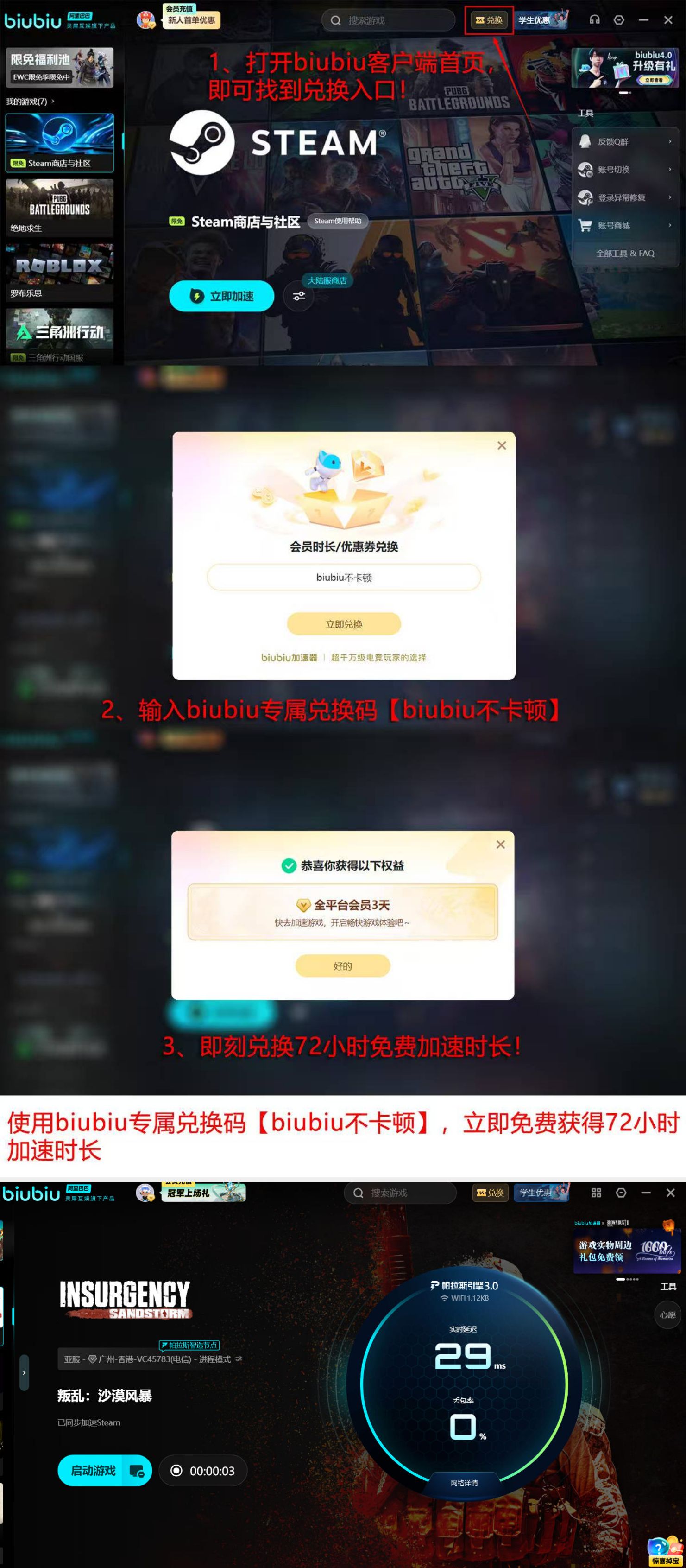 新用户注册后可即时获得24小时全功能加速时长;完成账户验证后,在兑换码栏输入【biubiu不卡顿】,还可额外激活72小时服务权限,累计达96小时。该周期足以覆盖多场完整排位赛程,便于玩家充分验证加速效果与稳定性表现。