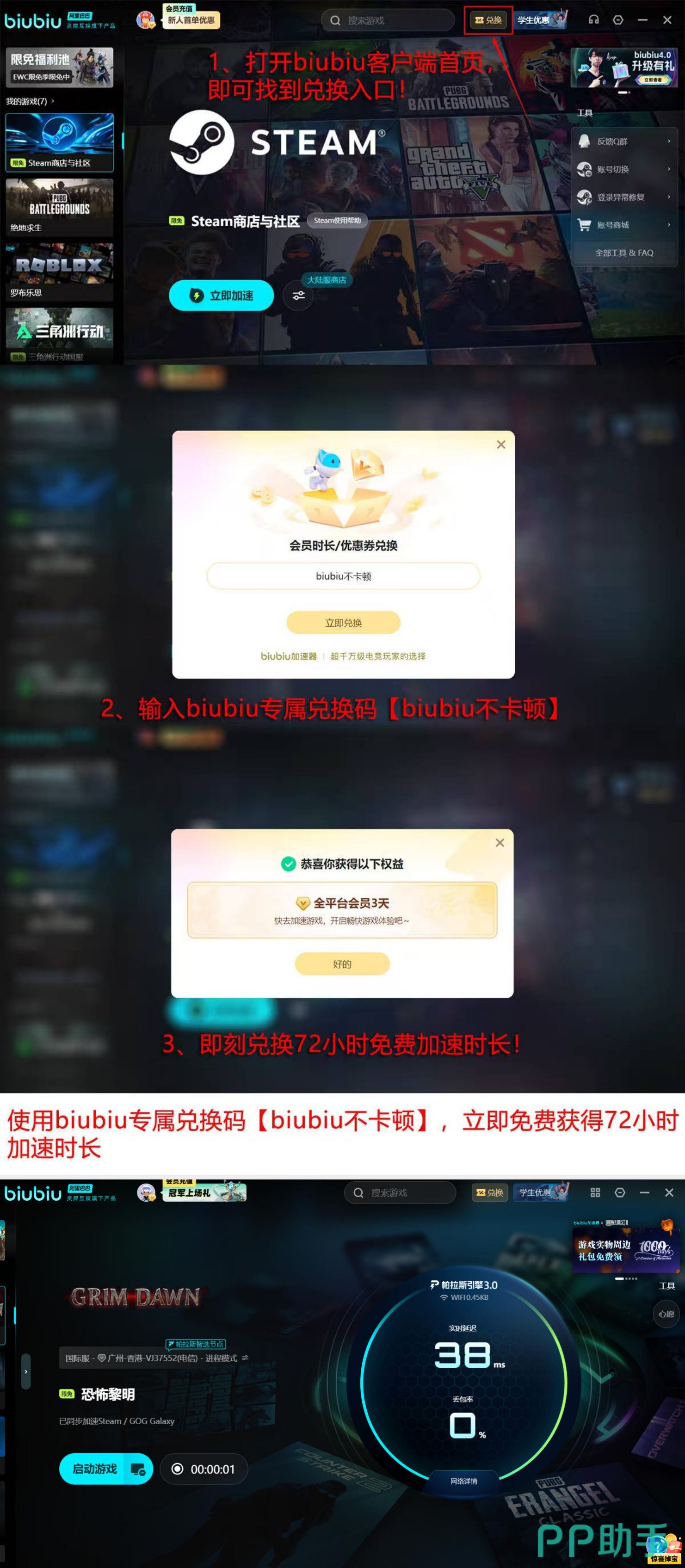 针对新用户,平台提供即开即用的免费体验权益:完成注册后自动获得24小时全功能加速时长;使用兑换码【biubiu不卡顿】还可追加72小时服务,累计达96小时,覆盖完整开荒期与中期BD成型阶段。