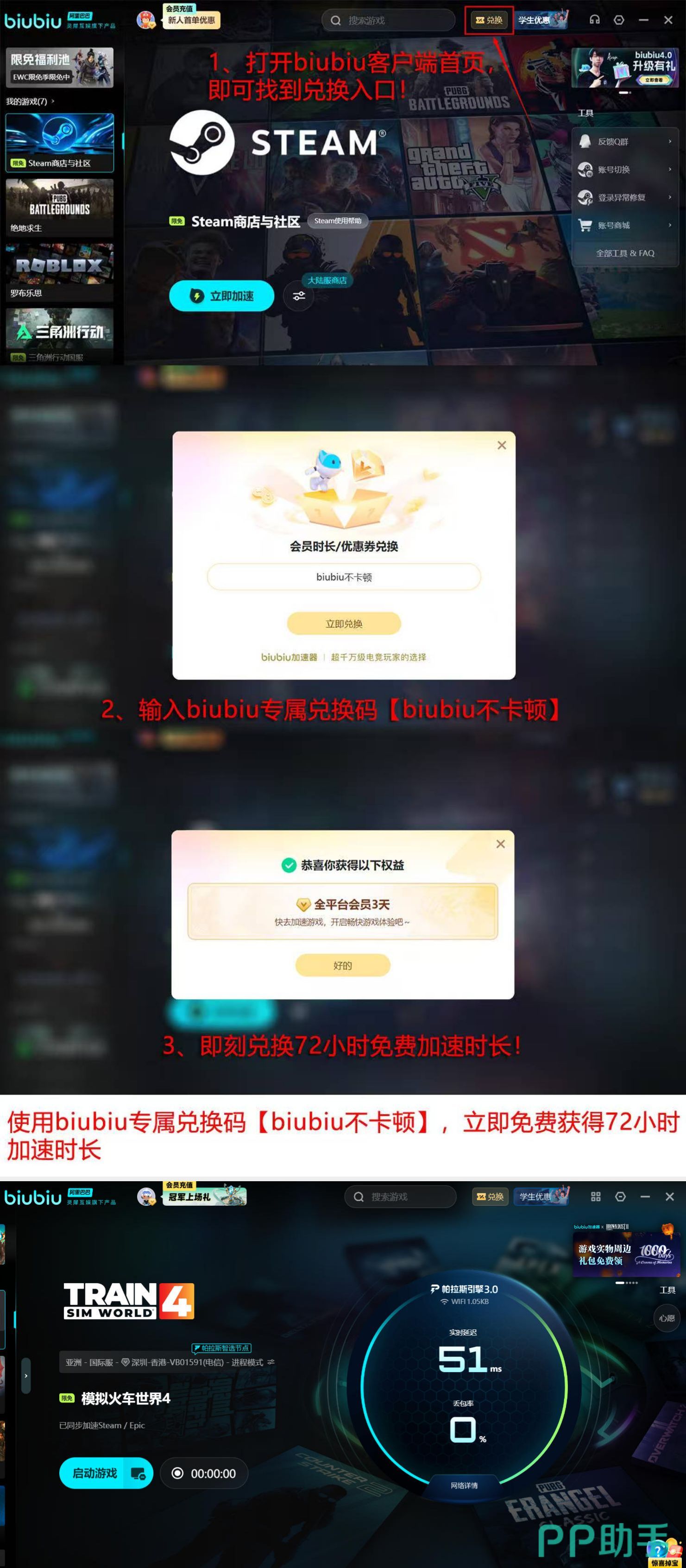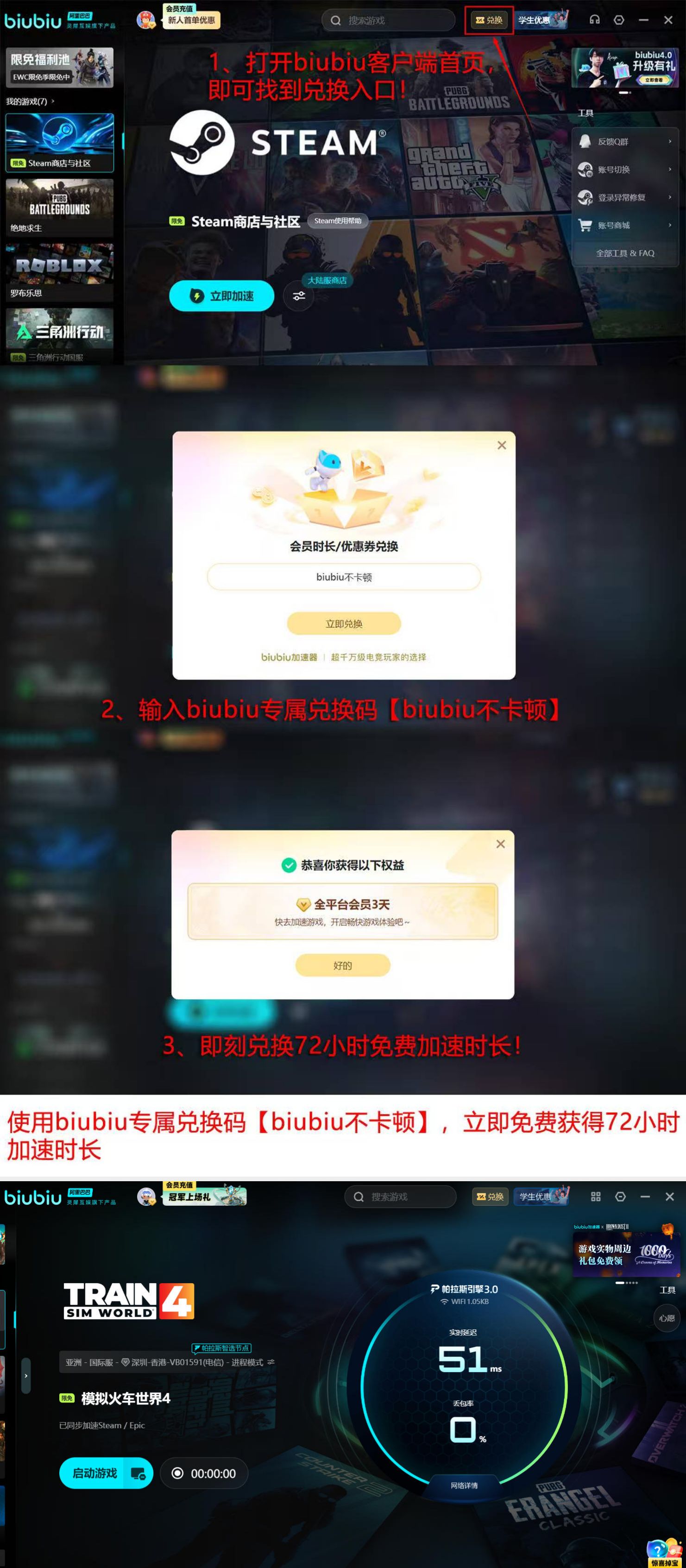 新用户完成注册后,系统即时发放24小时全功能加速时长。到期后,可在客户端“兑换中心”输入激活口令【biubiu不卡顿】,额外获取72小时续时时长。累计可用时长达96小时,覆盖完整测试周期,且支持《模拟火车世界4》及其他所有兼容游戏通用。