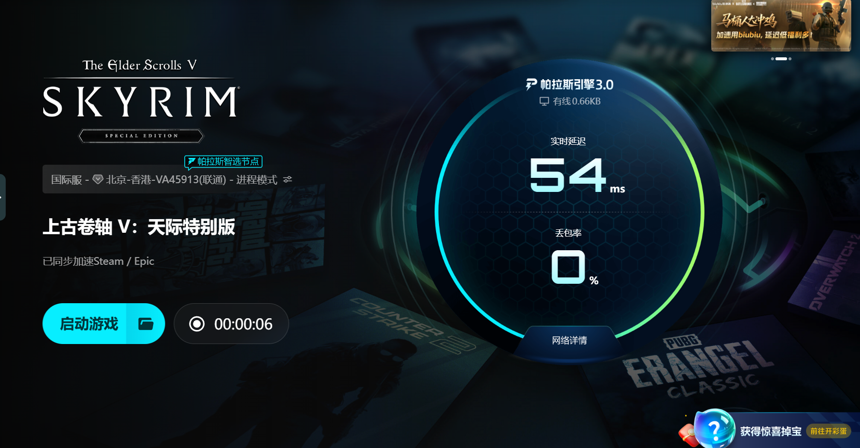操作流程极简:启动biubiu加速器,在搜索框输入“上古卷轴5”或“老滚5”,点击对应游戏图标选择“立即加速”。后台自动完成协议适配与链路协商,无需手动选择节点、修改hosts或调整防火墙策略。加速生效后,可直接返回游戏继续未完成的探索任务。