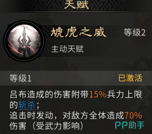 吕布的核心天赋为“追击斩杀”:每次发动追击时,对全体敌方单位造成70%攻击力的伤害,并附加相当于自身兵力上限15%的无视防御斩杀效果;天赋升至2级后,若通过该斩杀效果击败任意敌人,则立即对一名随机敌方单位追加75%攻击力的额外打击,每回合最多触发2次;升至3级后,将在每次造成伤害前,主动与敌方全体武将进行武力比拼,胜者获得伤害增益。