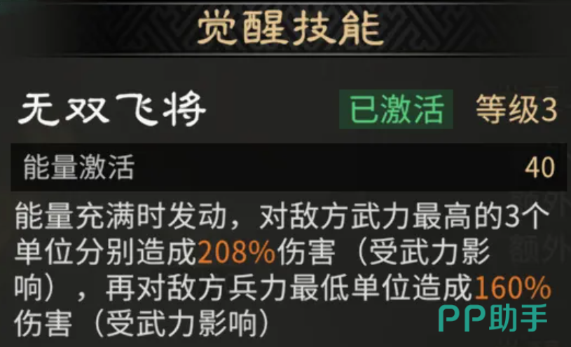 战斗中,每取得一次胜利,吕布自身武力值提升2点、斩杀伤害上限提升1%,该效果持续2回合,最多可叠加4层;其觉醒技需能量满格后自动释放,优先锁定敌方武力值排名前三的目标,各造成280%攻击力的高额伤害,随后对当前敌方兵力最低的单位补足160%攻击力的终结打击。