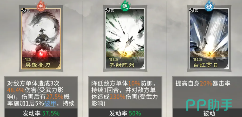该阵容对英雄培养进度有一定门槛,建议在中后期成型——需确保貂蝉与吕布均达到金阶品质,并解锁天赋3级效果,方可完整激活武力比拼、多重追击与斩杀连锁等关键机制。吕布技能配置方面,推荐携带图示所示的三组主动技能,兼顾生存韧性、追击衔接与爆发节奏控制。