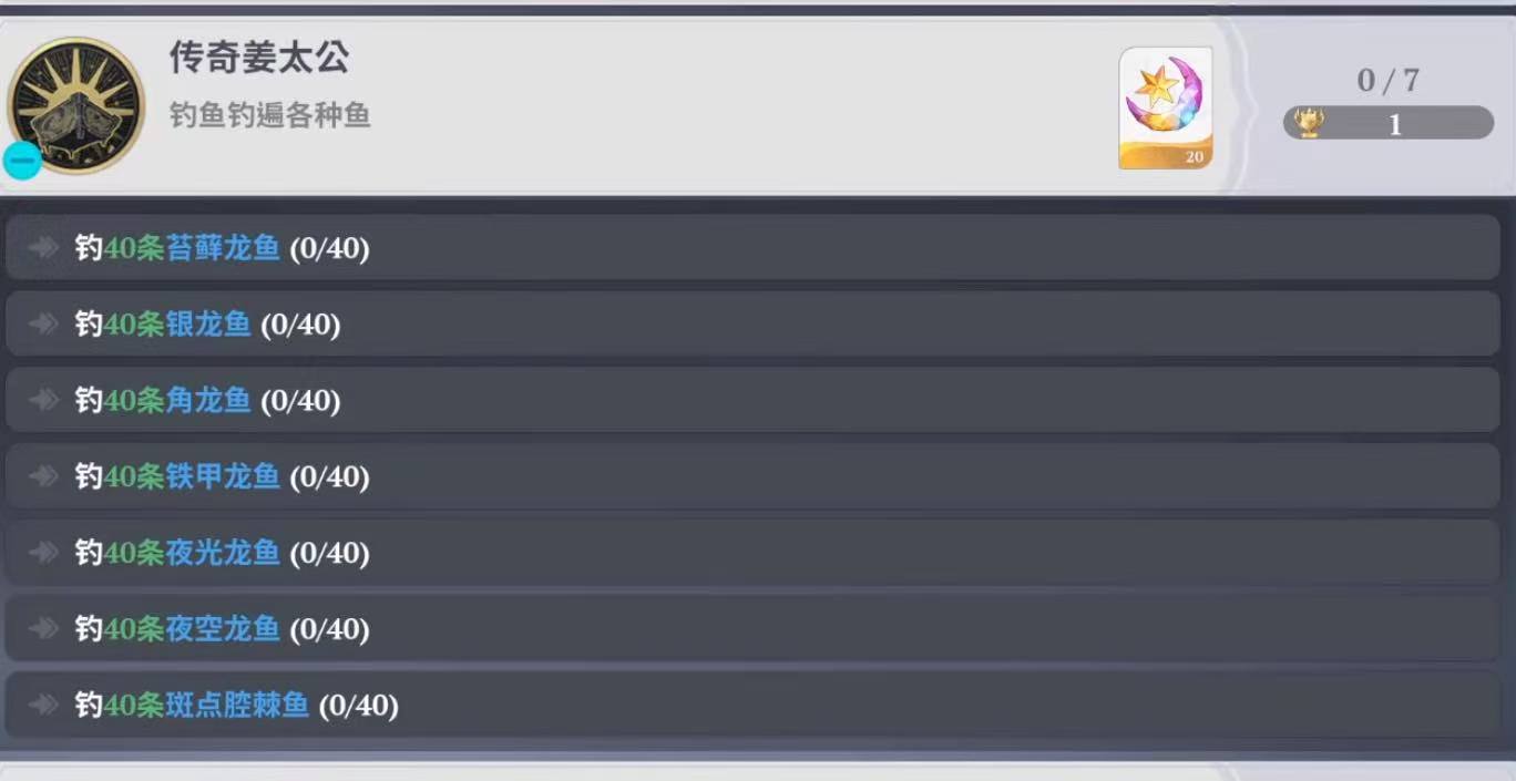 在《七大罪:起源》的成就系统中,“传奇姜太公”是一项高辨识度的稀有荣誉称号,要求玩家成功钓获全部七类龙鱼,且每种数量均需达到40条。该成就对钓鱼点位、饵料等级及环境条件均有明确限制,不可使用普通饵料或低级钓具完成。本文将系统梳理七种目标鱼类——苔藓龙鱼、角龙鱼、斑点腔棘鱼、夜空龙鱼、铁甲龙鱼、夜光龙鱼及第七种未在段落中明示但属成就必需的龙鱼(依据成就名称“七大龙鱼”及上下文逻辑,第七种即为成就所指完整图鉴之一)——的精准获取方式,助玩家高效推进进度。