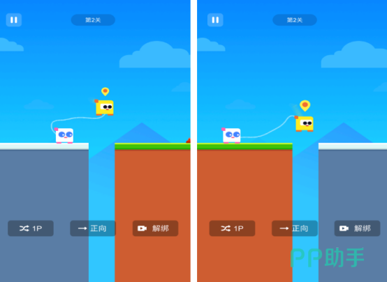 以绳索羁绊为核心机制的合作闯关游戏。两位玩家各自操控一名卡通角色,全程通过虚拟绳索物理连接,跳跃、攀爬、摆荡等动作均需同步预判与协同执行。关卡难度梯度合理,从基础移动逐步过渡至多阶段机关联动,潜移默化训练儿童因果推理与同步协作能力。