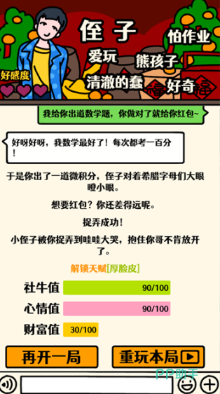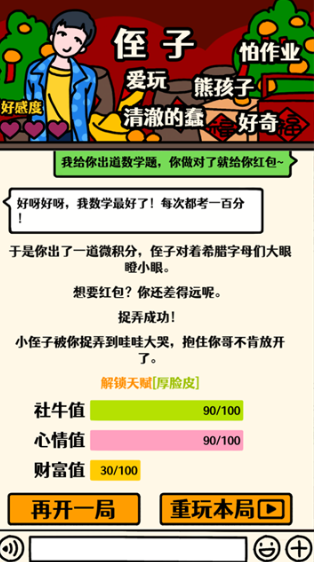 本作高度还原传统春节走亲访友的真实场景。从长辈盘问婚恋状况,到亲戚追问职业发展,对话设计既具代入感又不失幽默张力。每次提问均提供差异化回应选项,不同选择将触发分支剧情与多元结局,考验玩家的情商判断与临场应变能力。每位亲属角色拥有独立性格设定:有人通情达理,有人固执较真,玩家可通过语气、策略甚至适度反讽实现个性化应对,增强代际互动趣味性。
