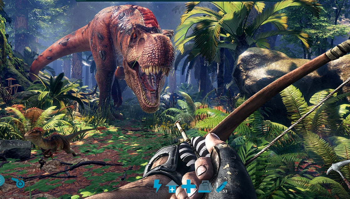 生物系统是本作的核心亮点之一。游戏中实装超100种可交互史前生物,涵盖陆地、空中与海洋三大生态位。玩家可通过投喂、击晕、骑乘等方式实现对多数生物的驯化,用于探索代步、物资运输、战斗协防等场景。部分物种支持交配繁育,后代属性可继承并变异,助力组建个性化恐龙作战单位。科技树横跨石器时代至未来科技阶段,从木质长矛、燧石斧,逐步升级至能量护盾、飞行载具与自动化防御塔,成长路径高度开放。