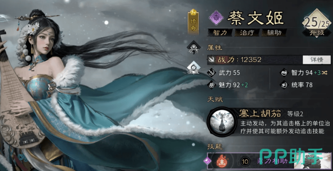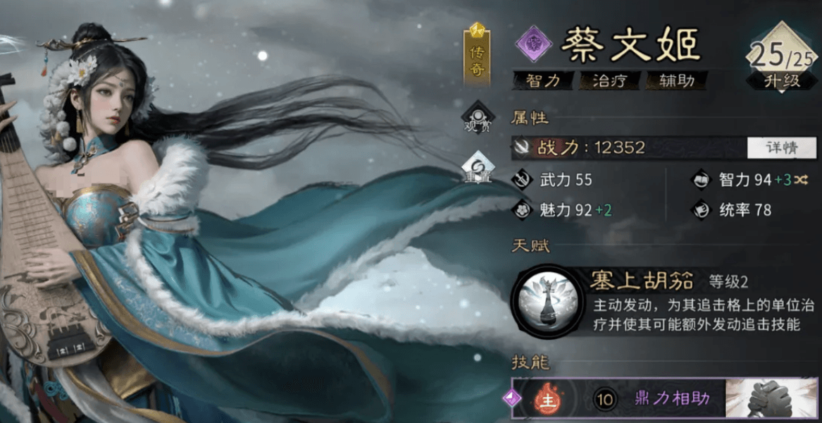 蔡文姬是前期极易获取且泛用性极高的辅助型武将。其天赋“塞上胡笳”在主动行动时,为追击格内单位提供100%兵力回复,并附加“余音”状态;该状态可在追击技命中后,以一定概率再次触发技能效果。觉醒技于能量充满时发动,为全体友军恢复128%兵力,并有25%概率随机赋予五音之一——分别提升暴击率10%、暴击伤害36%、命中率10%或闪避率8%,显著强化团队输出与生存容错。