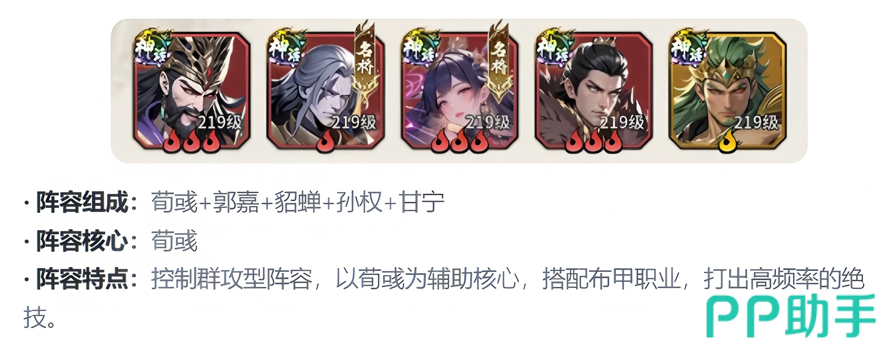 针对火系机制深度开发的流派,“周瑜+董卓+高顺+曹操+周泰”构成典型点燃联动阵容。周瑜技能可为多名友军附加“引燃”标记,当标记叠加至阈值后触发爆炸伤害,董卓与周泰进一步提升点燃覆盖率,高顺强化前排抗压能力,曹操则优化全队技能释放频率,实现多段高频伤害投射。