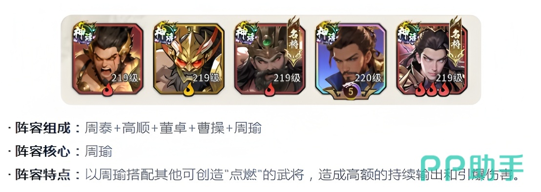 另一套具备高策略深度的体系是以周瑜为核心的“烈焰引爆流”:联动董卓(灼烧叠加)、高顺(禁疗封锁)、曹操(火系增伤)、周泰(反伤护盾)。周瑜的点燃效果可触发队友技能联动,使灼烧伤害层层递进,尤其适合应对高血量或高回复型对手。