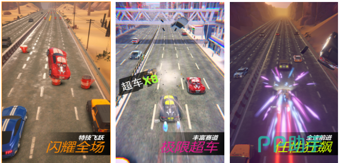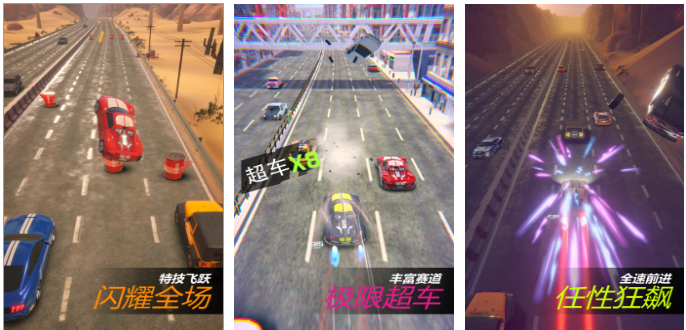 创新采用竖屏3D视角设计,融合跑酷式闪避机制与高速竞速逻辑。玩家需在行进中预判障碍位置并完成精准侧滑超车,触发连击加速可叠加速度增益。全车系配备独立技能树,包括悬浮跃迁、磁吸牵引、短距瞬移等差异化能力,配合粒子特效与动态镜头抖动,营造高强度感官刺激。