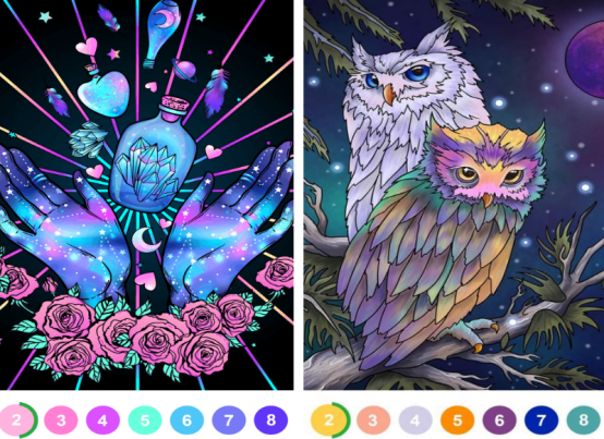 主打经典数字填色模式,画面风格唯美细腻,题材覆盖人物肖像、自然植物、抽象艺术等多个方向。每张图均标注清晰数字编号,玩家点击调色盘选取对应色块,逐步还原原图神韵。关卡设计循序渐进,随进度解锁更高难度图谱,在沉浸式涂色过程中锻炼专注力与色彩感知力。