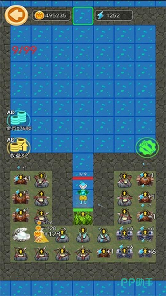 以开放海域为舞台,采用网格化地形系统,区分陆地与水域单元格。开局仅拥有少量可部署区域,需合理配置炮塔类型与阵型结构,抵御周期性来袭的海怪群。每次成功击退敌人后,己方控制范围将向外扩张一格,形成动态成长地图;同时支持实时查看怪物属性,实现针对性布防策略调整。