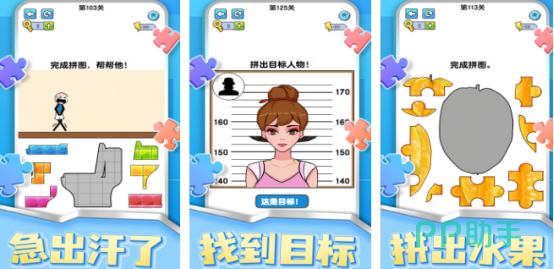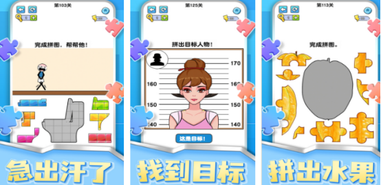 主打异形碎片解构挑战,所有拼图单元采用非标准几何形态设计,强调边缘咬合逻辑。关卡任务类型丰富,既包含人物剪影还原、水果轮廓组装等具象目标,也涵盖抽象图案重构,要求玩家综合运用旋转、翻转与空间预判技巧完成高精度拼合。