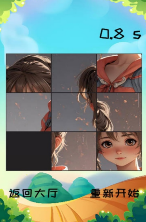 本作以传统九宫格拼图机制为基底,内置超60张主题化高清图库,覆盖二次元美少女、动画场景、自然风光等多元题材。每局开局自动打乱碎片位置,随机性保障重复可玩性;玩家需在限定时间内完成图像复原,考验空间记忆与快速定位能力。