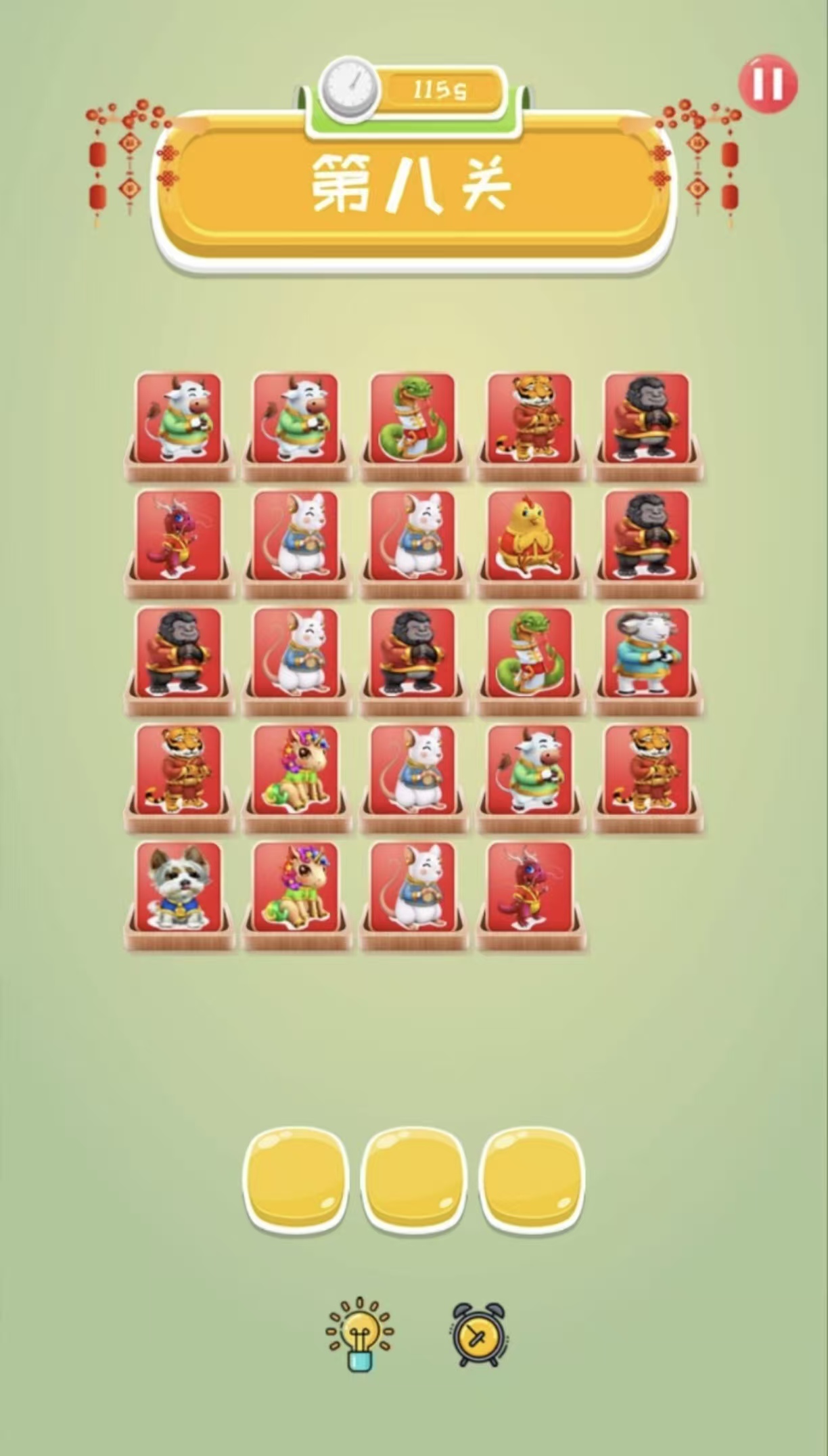 采用经典翻牌配对玩法,所有卡面均以十二生肖为视觉主体。玩家需在限定时间内找出两两相同的生肖图案完成消除,难度随关卡推进逐步提升:初始阶段时间充裕、牌面较少;后期则压缩响应窗口、增加干扰牌数量,并引入动态翻转、镜像布局等进阶机制,全面检验短期记忆与空间判断能力。