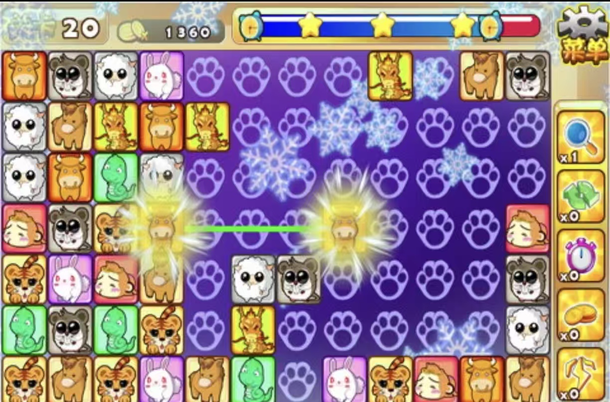 以十二生肖拟人化角色为核心,每个动物均配备独立造型与动作反馈。核心玩法为三消变体,玩家通过交换相邻图标组成横纵三连及以上进行清除。关卡持续追加新机制,例如冰冻格、锁链障碍、传送门等,要求手眼协调与策略预判并重。累计消除数量决定星级评定,集满三颗星方可解锁后续章节,整体美术风格清新明快。