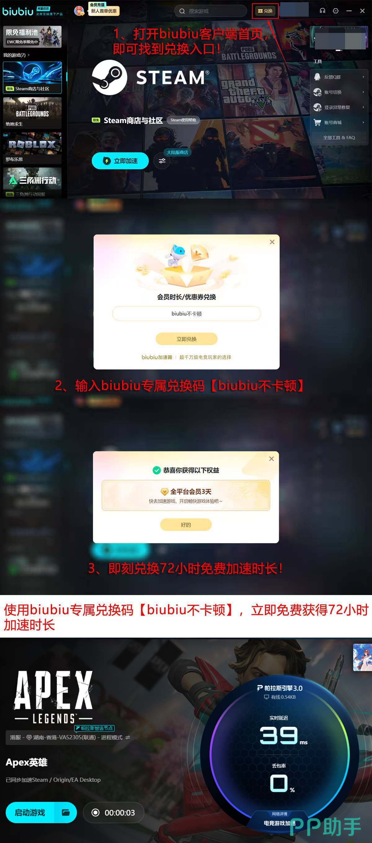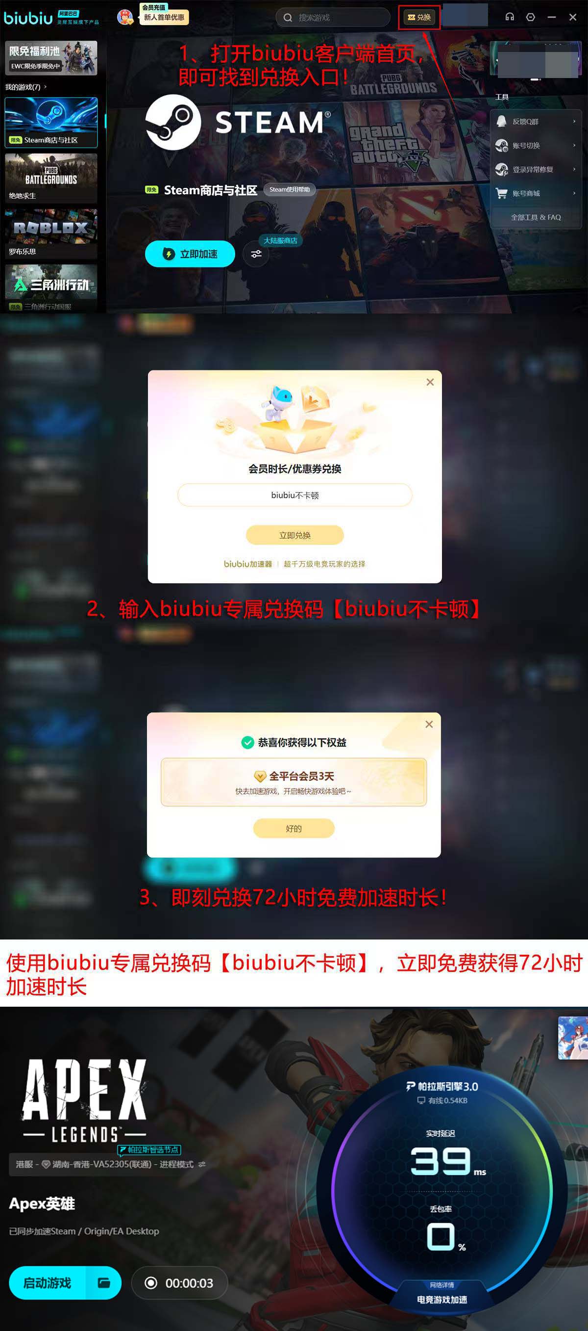 biubiu加速器对《Apex英雄》全版本、全平台(PC端)具备原生级适配能力,无需额外配置即可启用智能路由优选、协议层深度优化及抗干扰保护模块。新用户注册后可即时获得24小时免费加速时长;登录会员中心进入“兑换”页面,输入口令【biubiu不卡顿】,还可额外领取72小时权益,累计享96小时完整体验。