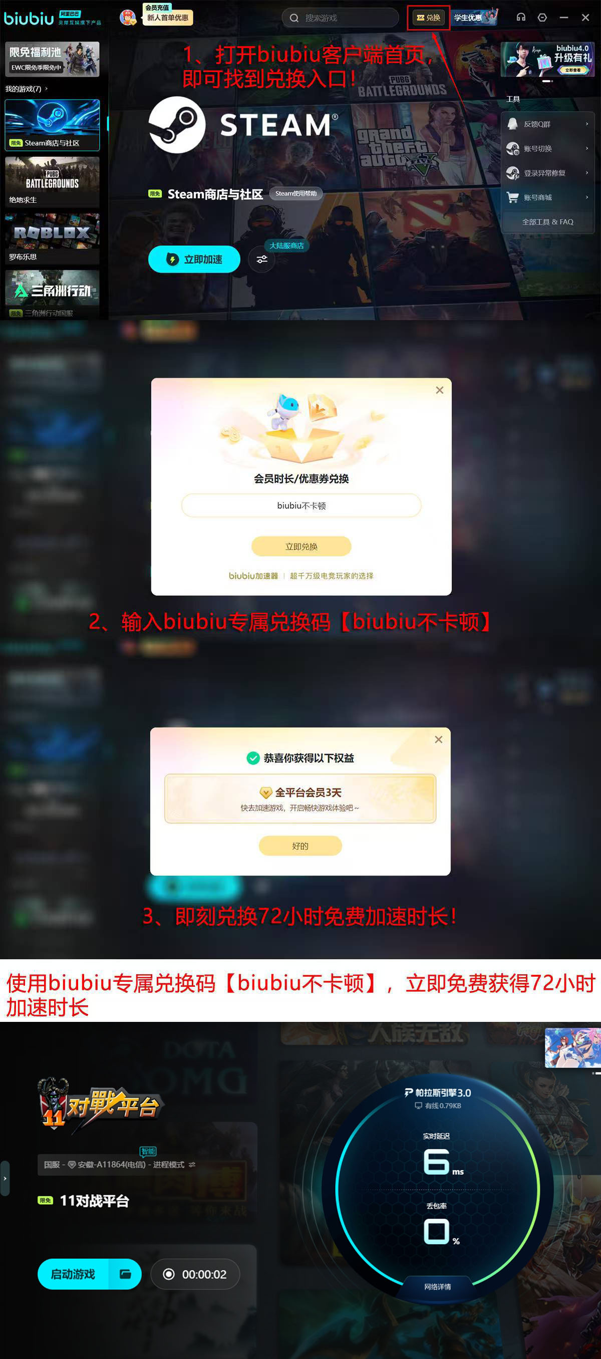 若在11对战平台运行任意游戏时频繁出现卡顿、延迟飙升或强制退出,建议优先启用biubiu加速器进行网络层诊断与优化。新用户登录即可获赠24小时免费加速时长;另可在首页输入兑换码【biubiu不卡顿】领取72小时权益,合计享96小时无限制加速服务。
