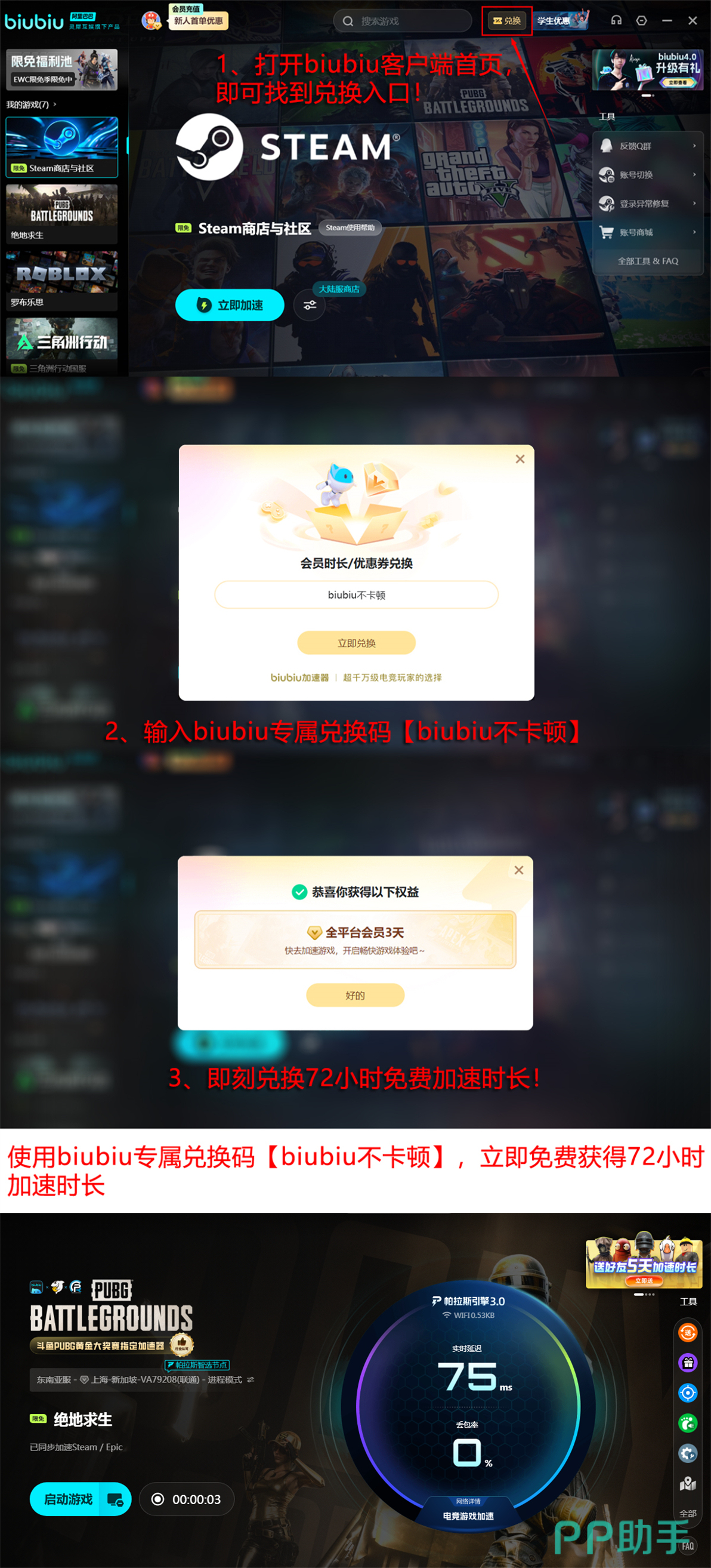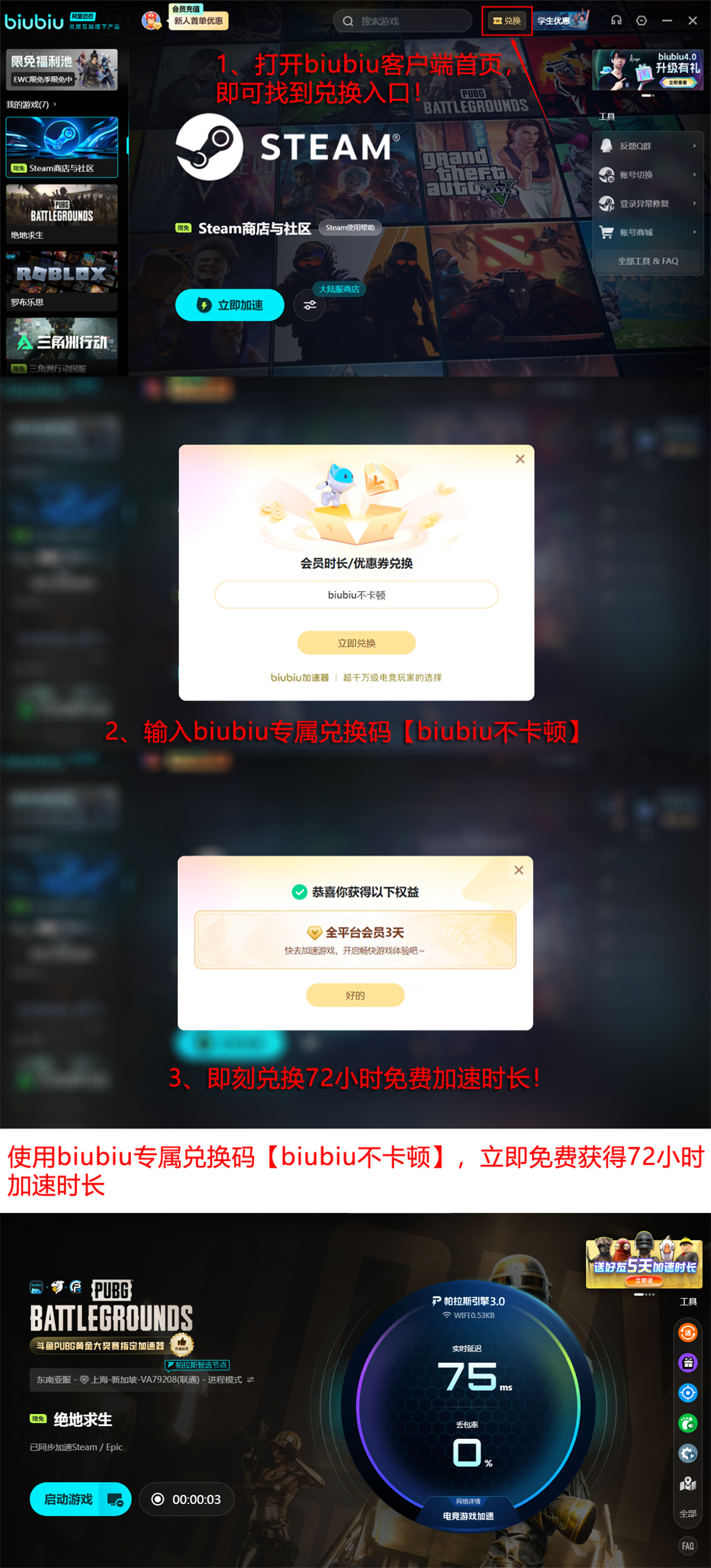 首次使用biubiu加速器的用户,注册全新账号即可立即获得24小时全游戏免费加速时长。所有已注册用户还可凭通用兑换码【biubiu不卡顿】领取72小时加速权益,新老用户叠加享总计96小时无门槛加速服务,福利力度业内领先。平台同步运营活跃的游戏社区,持续更新PUBG战术指南、地图机制解析、版本平衡解读等原创内容,全部开放免费查阅。