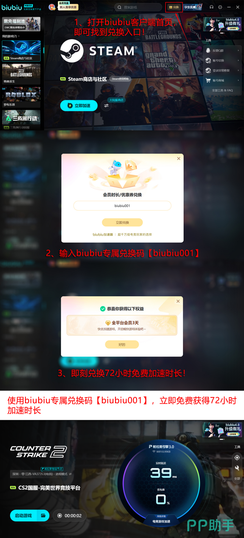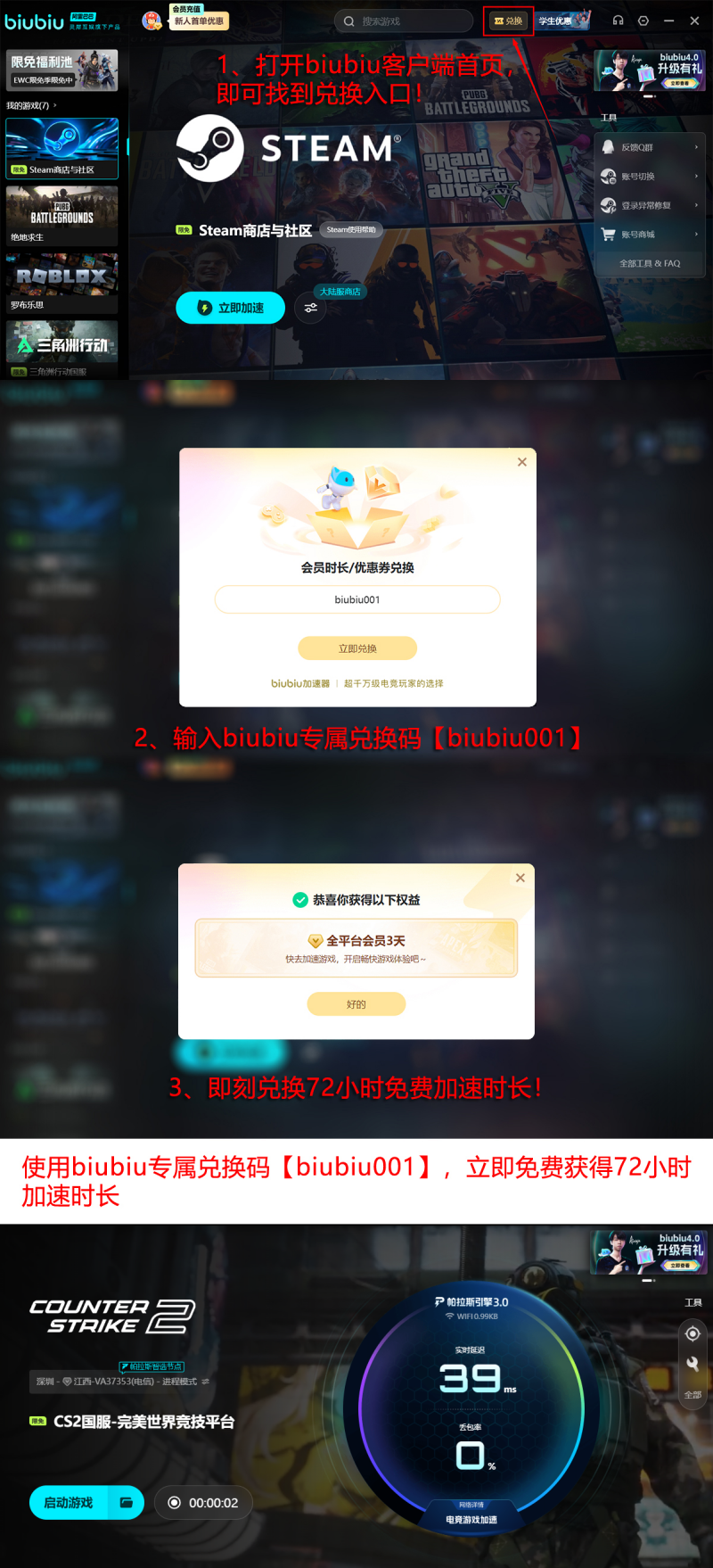 当前新老用户均可享受实质性福利:输入通用兑换码【biubiu001】,即可领取3天免费加速时长;首次注册用户额外获赠24小时专属礼包。两项权益可叠加使用,最高累计达96小时无限制加速服务,切实保障长时间对战过程中的网络稳定性与画面连续性。