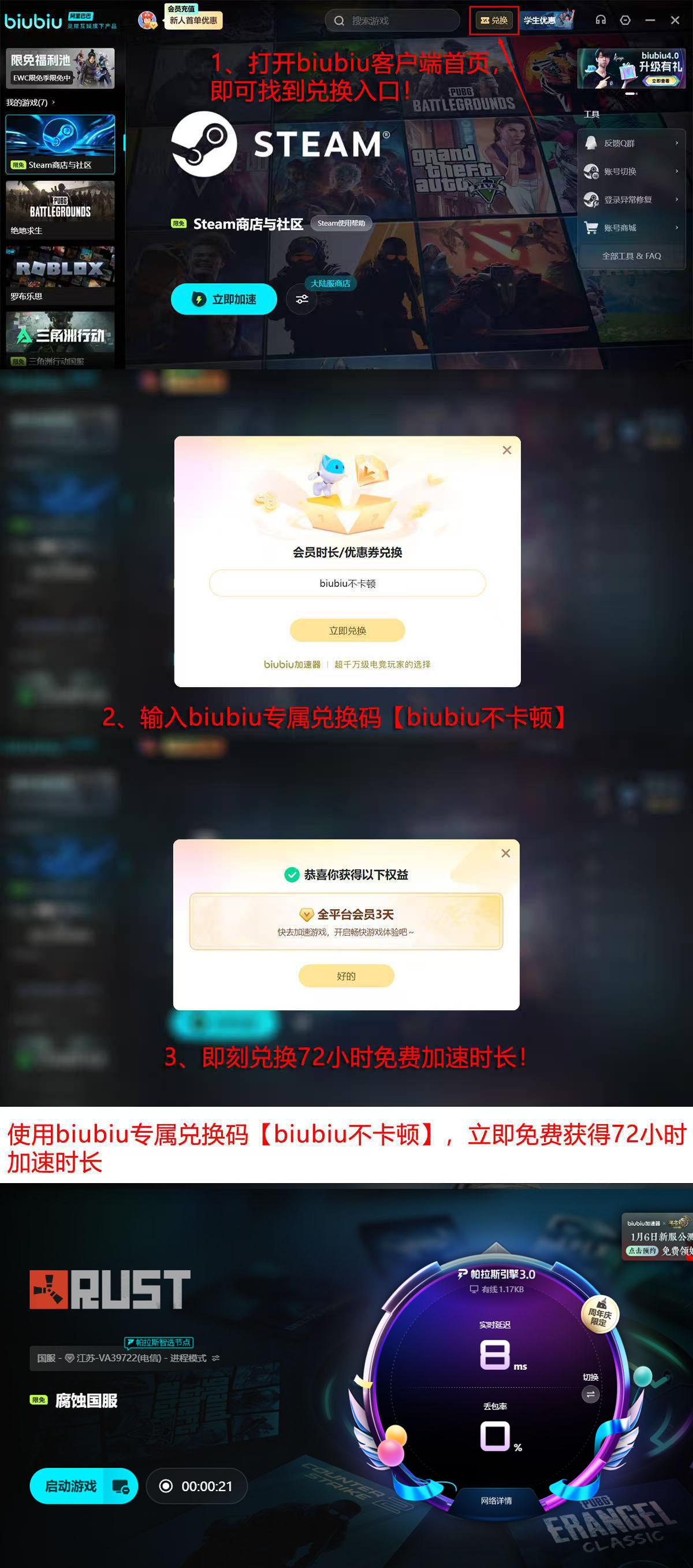 实际使用中,启用biubiu加速器后,Rust用户可明显感知登录响应时间缩短、地图加载更迅速、交互指令反馈更及时。为降低体验门槛,新用户注册即赠4天免费加速时长;完成首页“兑换”操作并输入口令【biubiu不卡顿】,还可额外领取72小时权益,累计可达96小时无限制加速体验。