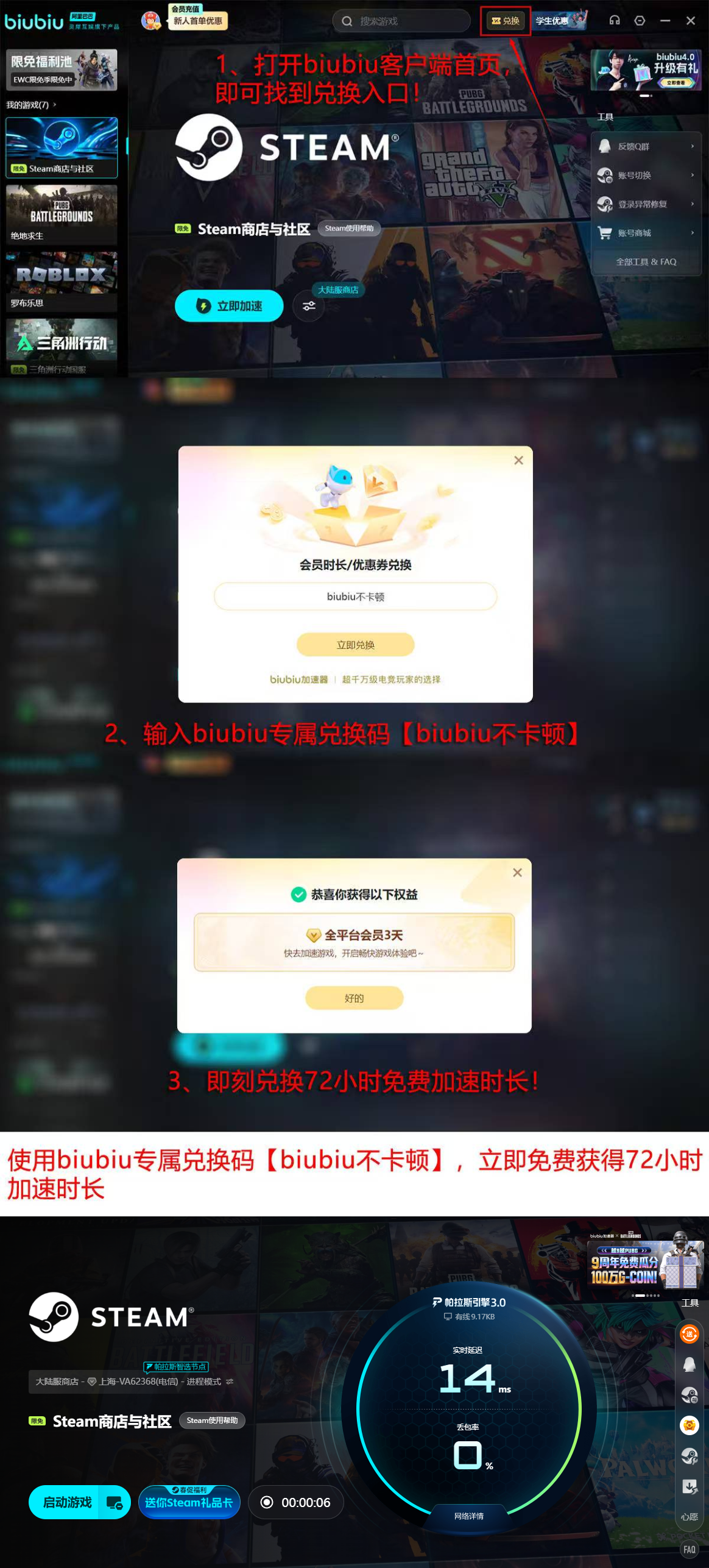 针对初次使用者,biubiu加速器设置零门槛体验机制:完成账号注册后,系统自动发放24小时全功能免费加速时长;所有用户(含已注册账号)均可在客户端内输入兑换码【biubiu不卡顿】,额外领取72小时加速权益。该组合福利覆盖多数单次游戏采购周期,无需任何付费操作即可完成Steam商店全流程访问。