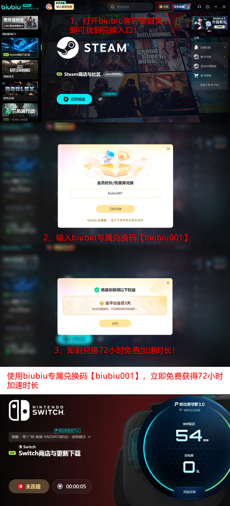 当前新用户注册即赠24小时免费试用权益;叠加专属兑换码【biubiu001】,还可额外获得3天加速时长。两者叠加,首登用户总计可享96小时无限制加速服务,覆盖《塞尔达传说:王国之泪》多人协作、《超级马里奥兄弟:奇异之旅》联机挑战等主流作品,全程零费用体验流畅联网。