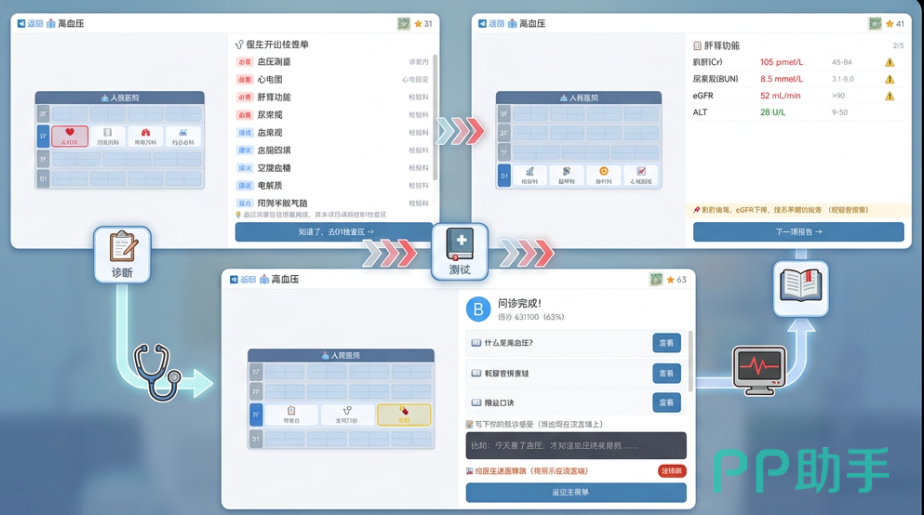 游戏的核心价值在于构建高度拟真的医学实践场景。从主诉采集、体格检查到辅助检验解读,每一步都严格参照基础诊疗规范设计。面对多样化的症状组合,玩家需调用所学知识进行鉴别诊断,并在有限信息中权衡可能性,最终形成合理处置方案。这一过程不仅锻炼临床推理能力,也潜移默化地提升日常健康风险识别水平——例如读懂血压波动趋势、理解肝功能指标异常含义等实用技能。