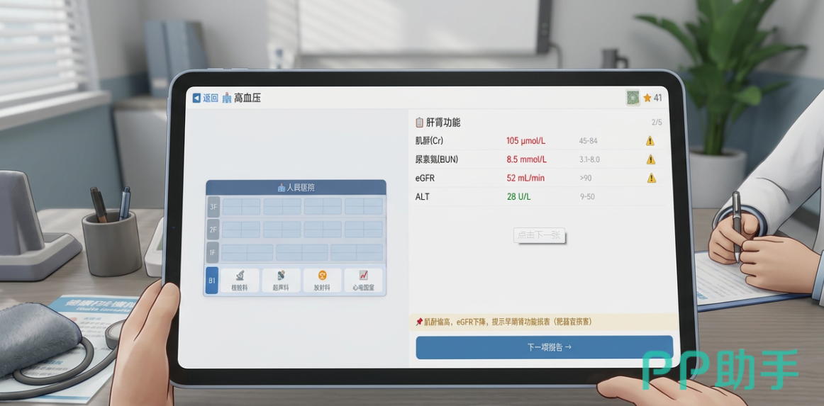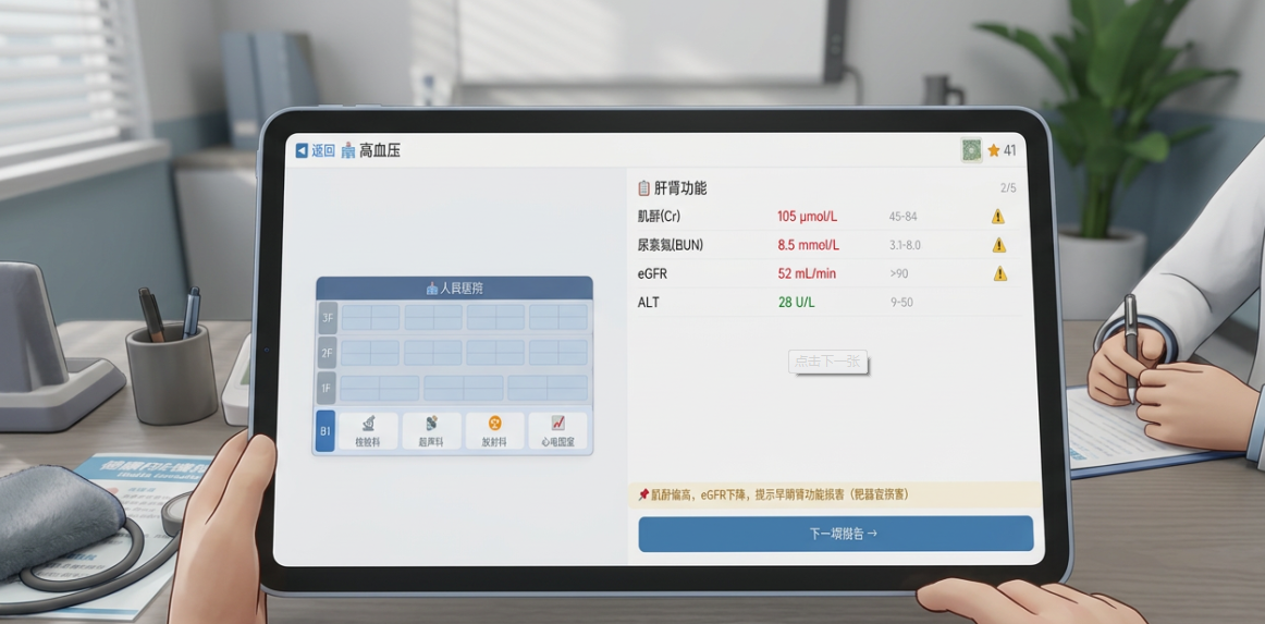 报告解析系统是本作最具教学深度的功能模块。每次完成模拟检查后,系统会自动生成结构化检验单与诊断建议书,涵盖血常规、尿液分析、心电图判读等常见项目。玩家需结合参考值范围、临床意义说明及典型图谱对照,逐步掌握术语定义与数据关联逻辑。长期练习可显著增强对体检报告的理解力,甚至能在家庭场景中为亲友提供初步健康咨询支持。