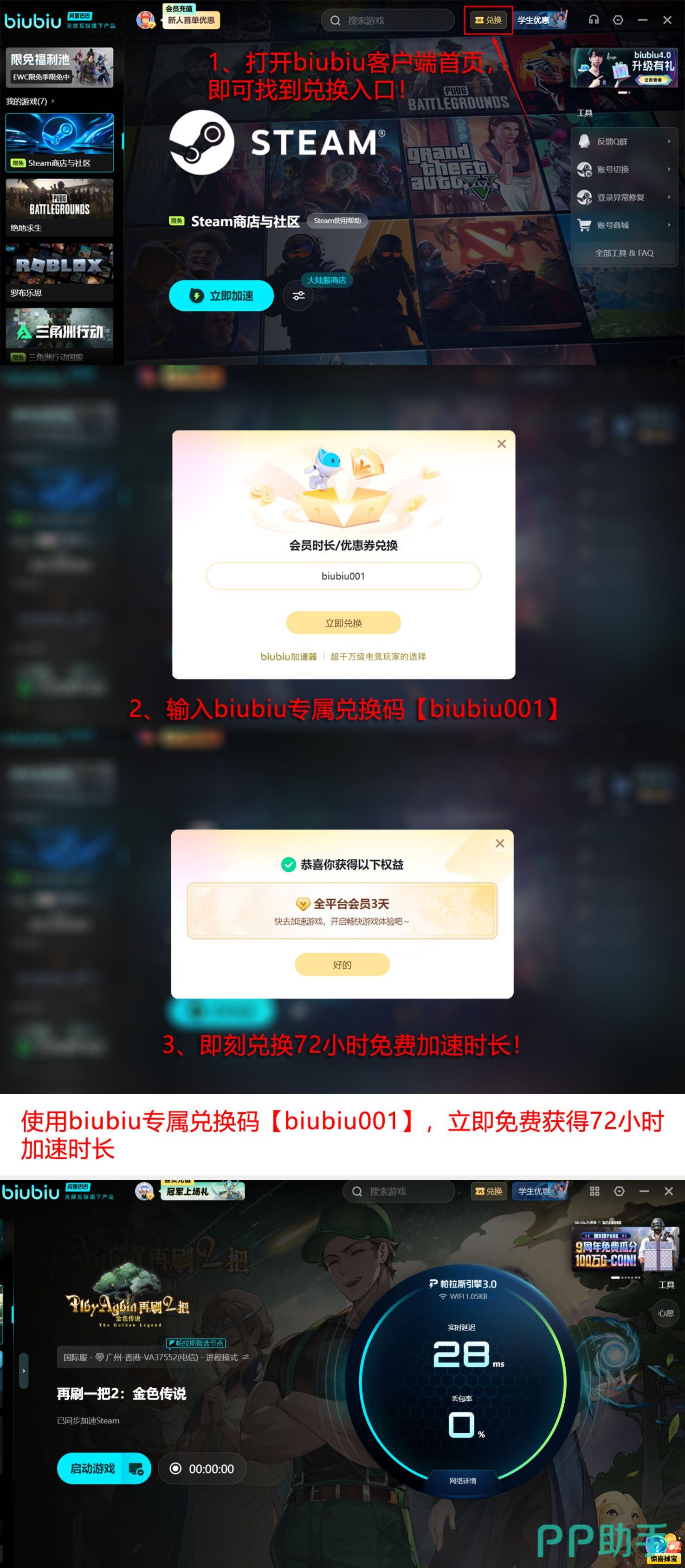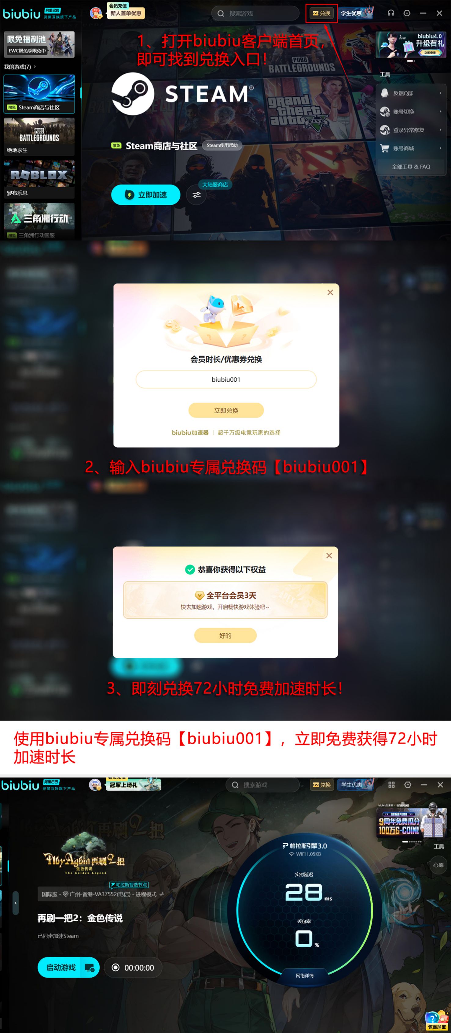 知名电竞主播“绝地求生冠军小叮当”已正式出任《biubiu加速器》产品体验官,并基于长期实测给予高度认可。目前平台面向新用户提供阶梯式免费加速权益:完成账号首次激活即可获得24小时全游戏通用加速时长;使用完毕后,输入专属兑换码【biubiu001】还可额外领取72小时加速权限,累计达96小时免费体验周期。