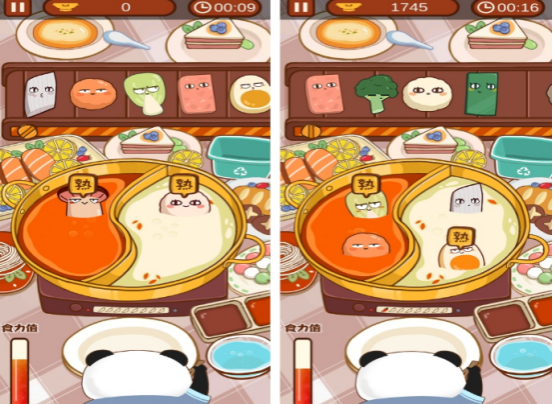 双人实时对抗型休闲游戏,以火锅用餐为创意载体,主角为拟人化熊猫形象,食材均赋予生动五官与动态反馈。核心玩法为比拼单位时间内吞食有效食材数量,每类食材入锅后通过文字提示判定可食用性,节奏明快、互动感强,兼具趣味性与解压效果。