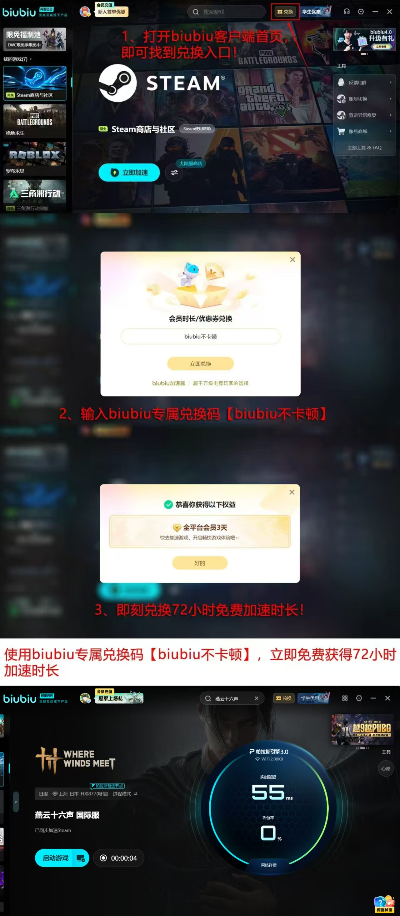 目前biubiu加速器面向新用户提供双重福利政策:完成首次注册并登录即可获赠24小时免费加速时长;输入专属兑换码【biubiu不卡顿】还可额外领取72小时加速权益,合计享96小时零成本高速网络服务。老用户同样可通过兑换码获取限时免费加速资格。会员充值方案按不同周期梯度定价,长期订阅享有更高性价比。