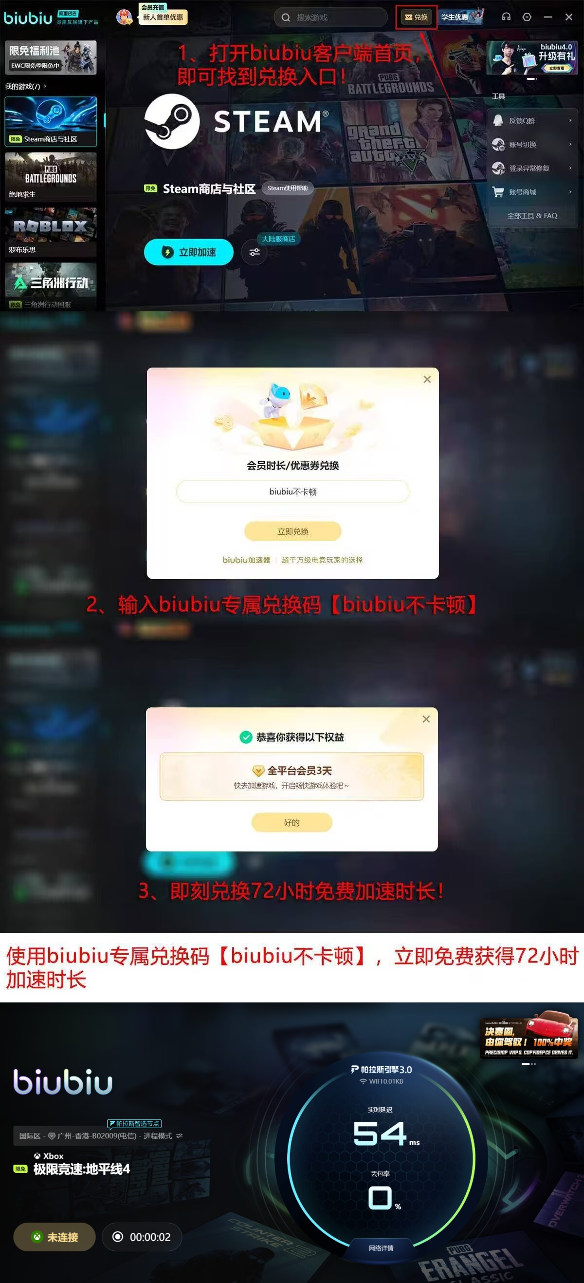为降低用户试用门槛,biubiu加速器现推出限时新人权益:完成首次注册并登录后,系统将自动发放24小时全节点免费加速时长;后续输入口令【biubiu不卡顿】,还可额外领取72小时专属加速权限。总计96小时内,用户可全面验证该工具在《地平线4》中的实际优化效果,包括但不限于地图加载速度提升、赛事匹配响应加快、车辆操控指令延迟降低以及联机稳定性增强等维度。