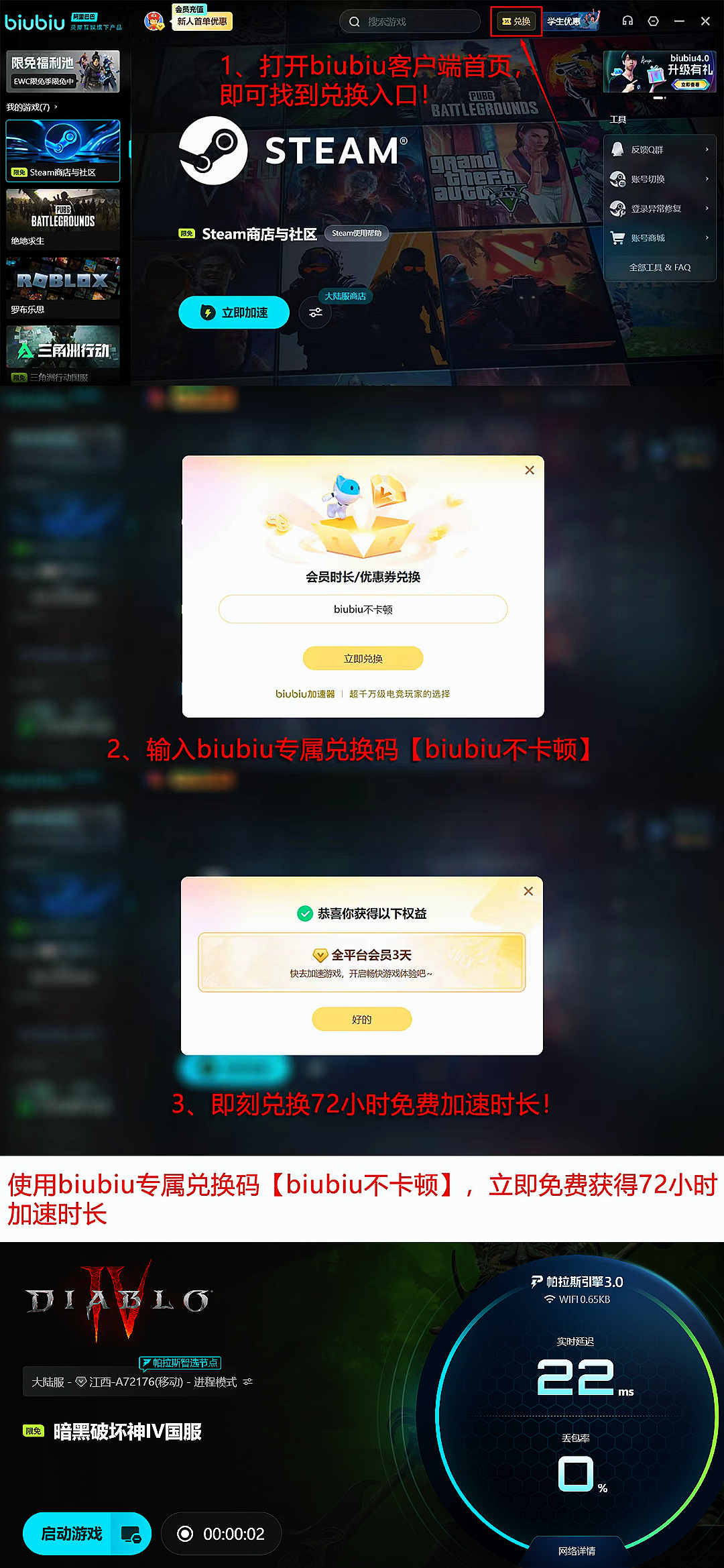 除网络优化外,biubiu加速器同步提供高性价比用户权益:新注册用户可即刻启用24小时全游戏免费不限速加速服务;所有用户在兑换中心输入专属激活码【biubiu不卡顿】,即可领取3天通用加速时长;新用户完成基础认证后,两项福利可叠加生效,总计获得96小时加速权限。