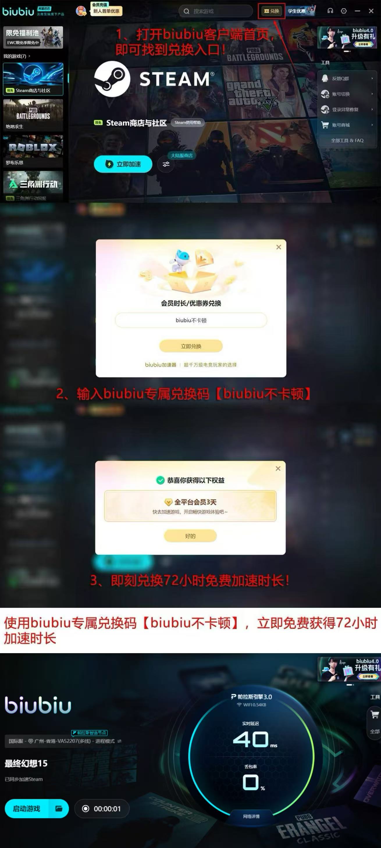 该工具由XDD小叮当担任品牌代言人,亦为其本人在PUBG职业赛事期间长期使用的指定加速方案。其底层采用自主研发的帕拉斯3.0加速引擎,通过多线程动态路由选择与TCP/UDP混合传输优化技术,显著提升连接稳定性,杜绝传统加速器常见的波动性延迟现象。新用户注册即赠24小时全功能试用权限,叠加兑换码【biubiu不卡顿】还可额外获得72小时加速时长,累计达96小时,足够完整体验主线+全部DLC核心战斗内容。