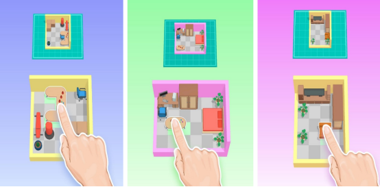 本作创新融合拼图逻辑与3D家具摆放机制,支持手指拖拽操作,在立体建模场景中实时调整家具位置与朝向。每个关卡对应独立空间结构,如大开间客厅需协调沙发、电视柜与落地灯的动线关系;卧室则侧重床体、衣柜与书桌的功能分区。全年龄适配设计,无操作门槛,兼顾趣味性与空间认知训练价值。